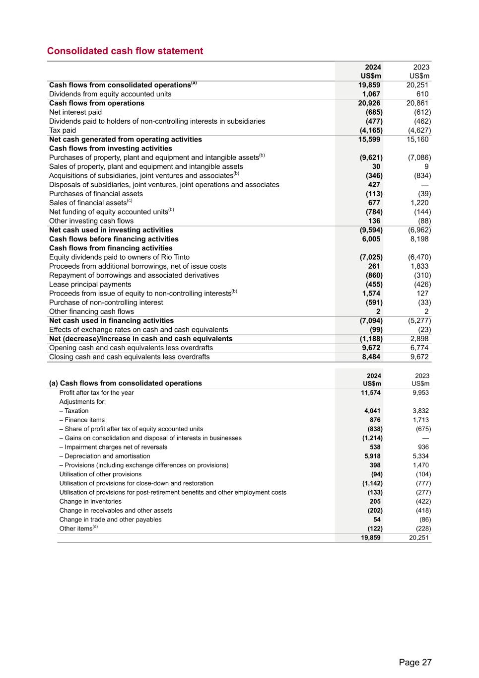 Consolidated cash flow statement 2024 US$m 2023 US$m Cash flows from consolidated operations(a) 19,859 20,251 Dividends from equity accounted units 1,067 610 Cash flows from operations 20,926 20,861 Net interest paid (685) (612) Dividends paid to holders of non-controlling interests in subsidiaries (477) (462) Tax paid (4,165) (4,627) Net cash generated from operating activities 15,599 15,160 Cash flows from investing activities Purchases of property, plant and equipment and intangible assets(b) (9,621) (7,086) Sales of property, plant and equipment and intangible assets 30 9 Acquisitions of subsidiaries, joint ventures and associates(b) (346) (834) Disposals of subsidiaries, joint ventures, joint operations and associates 427 — Purchases of financial assets (113) (39) Sales of financial assets(c) 677 1,220 Net funding of equity accounted units(b) (784) (144) Other investing cash flows 136 (88) Net cash used in investing activities (9,594) (6,962) Cash flows before financing activities 6,005 8,198 Cash flows from financing activities Equity dividends paid to owners of Rio Tinto (7,025) (6,470) Proceeds from additional borrowings, net of issue costs 261 1,833 Repayment of borrowings and associated derivatives (860) (310) Lease principal payments (455) (426) Proceeds from issue of equity to non-controlling interests(b) 1,574 127 Purchase of non-controlling interest (591) (33) Other financing cash flows 2 2 Net cash used in financing activities (7,094) (5,277) Effects of exchange rates on cash and cash equivalents (99) (23) Net (decrease)/increase in cash and cash equivalents (1,188) 2,898 Opening cash and cash equivalents less overdrafts 9,672 6,774 Closing cash and cash equivalents less overdrafts 8,484 9,672 (a) Cash flows from consolidated operations 2024 US$m 2023 US$m Profit after tax for the year 11,574 9,953 Adjustments for: – Taxation 4,041 3,832 – Finance items 876 1,713 – Share of profit after tax of equity accounted units (838) (675) – Gains on consolidation and disposal of interests in businesses (1,214) — – Impairment charges net of reversals 538 936 – Depreciation and amortisation 5,918 5,334 – Provisions (including exchange differences on provisions) 398 1,470 Utilisation of other provisions (94) (104) Utilisation of provisions for close-down and restoration (1,142) (777) Utilisation of provisions for post-retirement benefits and other employment costs (133) (277) Change in inventories 205 (422) Change in receivables and other assets (202) (418) Change in trade and other payables 54 (86) Other items(d) (122) (228) 19,859 20,251 Page 27