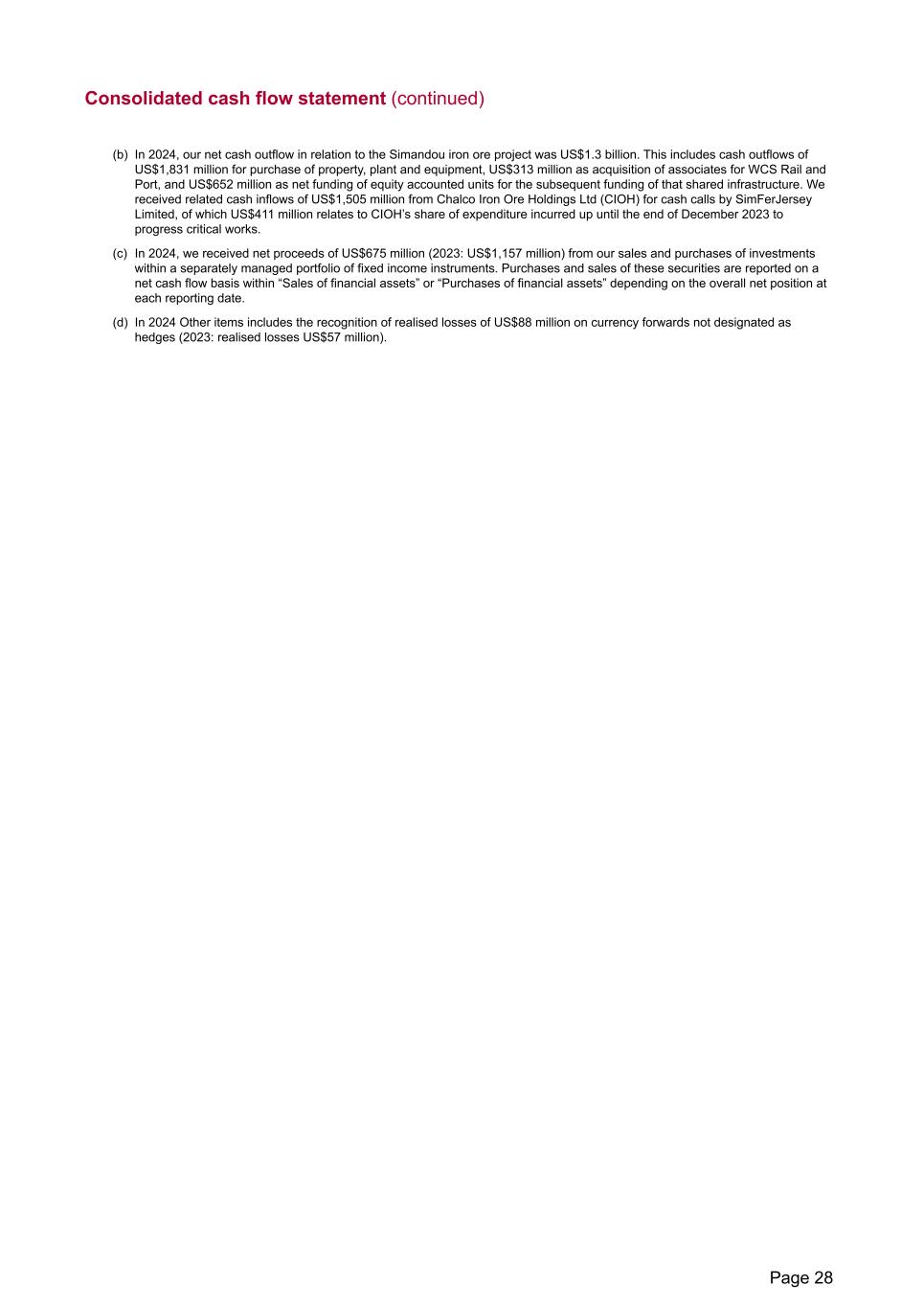 Consolidated cash flow statement (continued) (b) In 2024, our net cash outflow in relation to the Simandou iron ore project was US$1.3 billion. This includes cash outflows of US$1,831 million for purchase of property, plant and equipment, US$313 million as acquisition of associates for WCS Rail and Port, and US$652 million as net funding of equity accounted units for the subsequent funding of that shared infrastructure. We received related cash inflows of US$1,505 million from Chalco Iron Ore Holdings Ltd (CIOH) for cash calls by SimFerJersey Limited, of which US$411 million relates to CIOH’s share of expenditure incurred up until the end of December 2023 to progress critical works. (c) In 2024, we received net proceeds of US$675 million (2023: US$1,157 million) from our sales and purchases of investments within a separately managed portfolio of fixed income instruments. Purchases and sales of these securities are reported on a net cash flow basis within “Sales of financial assets” or “Purchases of financial assets” depending on the overall net position at each reporting date. (d) In 2024 Other items includes the recognition of realised losses of US$88 million on currency forwards not designated as hedges (2023: realised losses US$57 million). Page 28