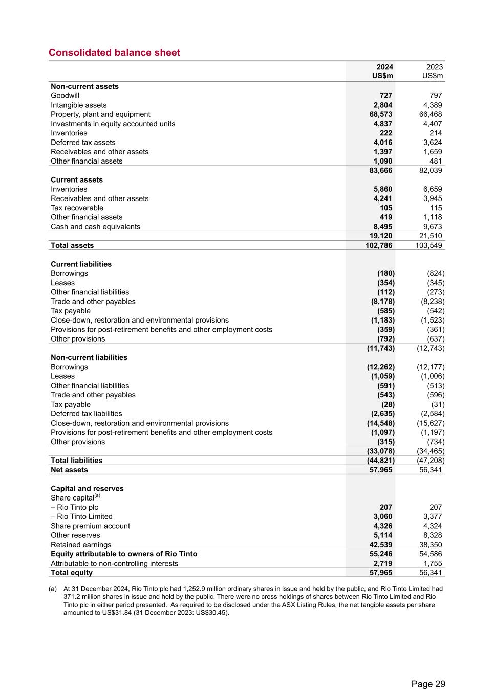Consolidated balance sheet 2024 US$m 2023 US$m Non-current assets Goodwill 727 797 Intangible assets 2,804 4,389 Property, plant and equipment 68,573 66,468 Investments in equity accounted units 4,837 4,407 Inventories 222 214 Deferred tax assets 4,016 3,624 Receivables and other assets 1,397 1,659 Other financial assets 1,090 481 83,666 82,039 Current assets Inventories 5,860 6,659 Receivables and other assets 4,241 3,945 Tax recoverable 105 115 Other financial assets 419 1,118 Cash and cash equivalents 8,495 9,673 19,120 21,510 Total assets 102,786 103,549 Current liabilities Borrowings (180) (824) Leases (354) (345) Other financial liabilities (112) (273) Trade and other payables (8,178) (8,238) Tax payable (585) (542) Close-down, restoration and environmental provisions (1,183) (1,523) Provisions for post-retirement benefits and other employment costs (359) (361) Other provisions (792) (637) (11,743) (12,743) Non-current liabilities Borrowings (12,262) (12,177) Leases (1,059) (1,006) Other financial liabilities (591) (513) Trade and other payables (543) (596) Tax payable (28) (31) Deferred tax liabilities (2,635) (2,584) Close-down, restoration and environmental provisions (14,548) (15,627) Provisions for post-retirement benefits and other employment costs (1,097) (1,197) Other provisions (315) (734) (33,078) (34,465) Total liabilities (44,821) (47,208) Net assets 57,965 56,341 Capital and reserves Share capital(a) – Rio Tinto plc 207 207 – Rio Tinto Limited 3,060 3,377 Share premium account 4,326 4,324 Other reserves 5,114 8,328 Retained earnings 42,539 38,350 Equity attributable to owners of Rio Tinto 55,246 54,586 Attributable to non-controlling interests 2,719 1,755 Total equity 57,965 56,341 (a) At 31 December 2024, Rio Tinto plc had 1,252.9 million ordinary shares in issue and held by the public, and Rio Tinto Limited had 371.2 million shares in issue and held by the public. There were no cross holdings of shares between Rio Tinto Limited and Rio Tinto plc in either period presented. As required to be disclosed under the ASX Listing Rules, the net tangible assets per share amounted to US$31.84 (31 December 2023: US$30.45). Page 29