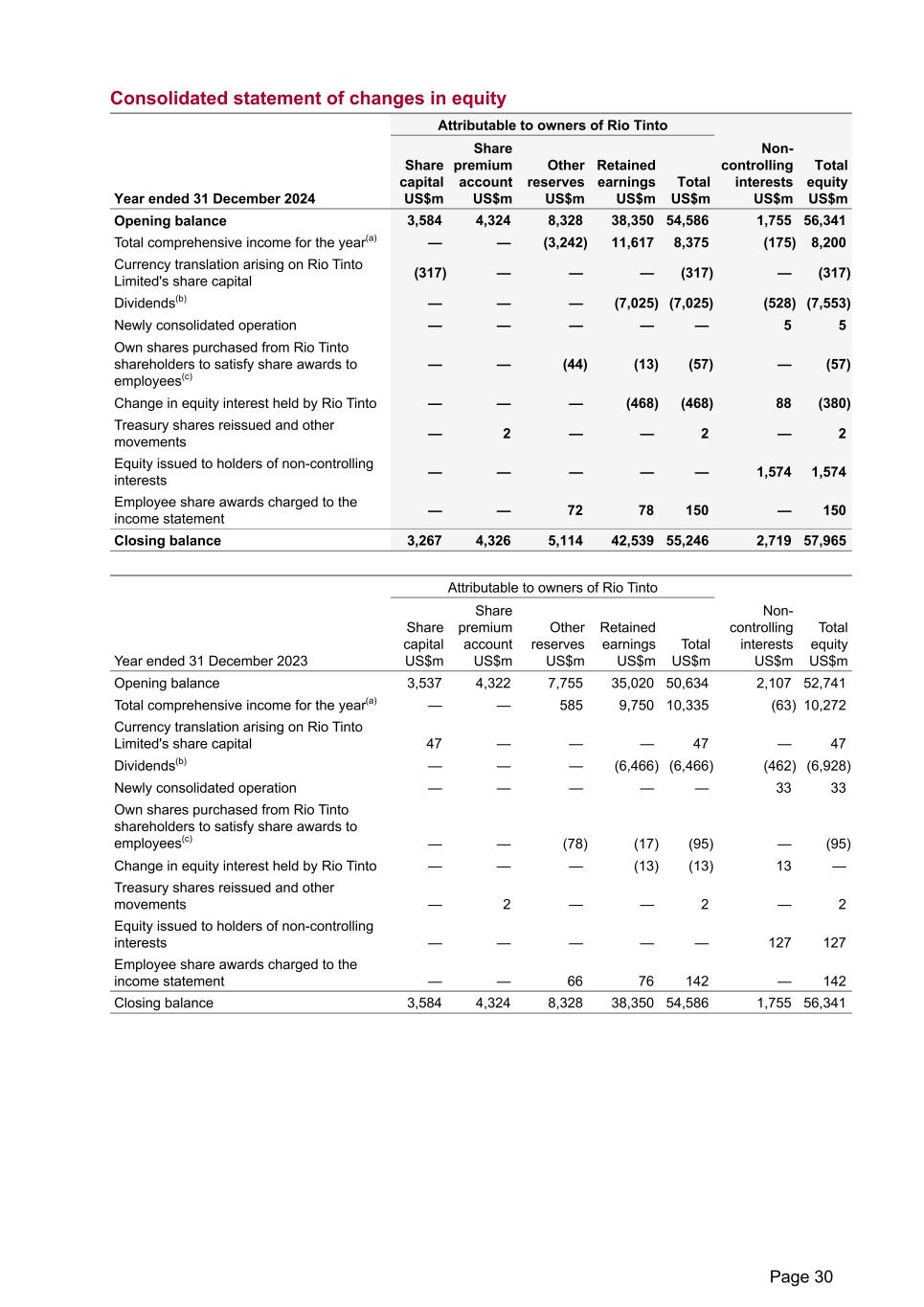 Consolidated statement of changes in equity Year ended 31 December 2024 Attributable to owners of Rio Tinto Share capital US$m Share premium account US$m Other reserves US$m Retained earnings US$m Total US$m Non- controlling interests US$m Total equity US$m Opening balance 3,584 4,324 8,328 38,350 54,586 1,755 56,341 Total comprehensive income for the year(a) — — (3,242) 11,617 8,375 (175) 8,200 Currency translation arising on Rio Tinto Limited's share capital (317) — — — (317) — (317) Dividends(b) — — — (7,025) (7,025) (528) (7,553) Newly consolidated operation — — — — — 5 5 Own shares purchased from Rio Tinto shareholders to satisfy share awards to employees(c) — — (44) (13) (57) — (57) Change in equity interest held by Rio Tinto — — — (468) (468) 88 (380) Treasury shares reissued and other movements — 2 — — 2 — 2 Equity issued to holders of non-controlling interests — — — — — 1,574 1,574 Employee share awards charged to the income statement — — 72 78 150 — 150 Closing balance 3,267 4,326 5,114 42,539 55,246 2,719 57,965 Year ended 31 December 2023 Attributable to owners of Rio Tinto Share capital US$m Share premium account US$m Other reserves US$m Retained earnings US$m Total US$m Non- controlling interests US$m Total equity US$m Opening balance 3,537 4,322 7,755 35,020 50,634 2,107 52,741 Total comprehensive income for the year(a) — — 585 9,750 10,335 (63) 10,272 Currency translation arising on Rio Tinto Limited's share capital 47 — — — 47 — 47 Dividends(b) — — — (6,466) (6,466) (462) (6,928) Newly consolidated operation — — — — — 33 33 Own shares purchased from Rio Tinto shareholders to satisfy share awards to employees(c) — — (78) (17) (95) — (95) Change in equity interest held by Rio Tinto — — — (13) (13) 13 — Treasury shares reissued and other movements — 2 — — 2 — 2 Equity issued to holders of non-controlling interests — — — — — 127 127 Employee share awards charged to the income statement — — 66 76 142 — 142 Closing balance 3,584 4,324 8,328 38,350 54,586 1,755 56,341 Page 30