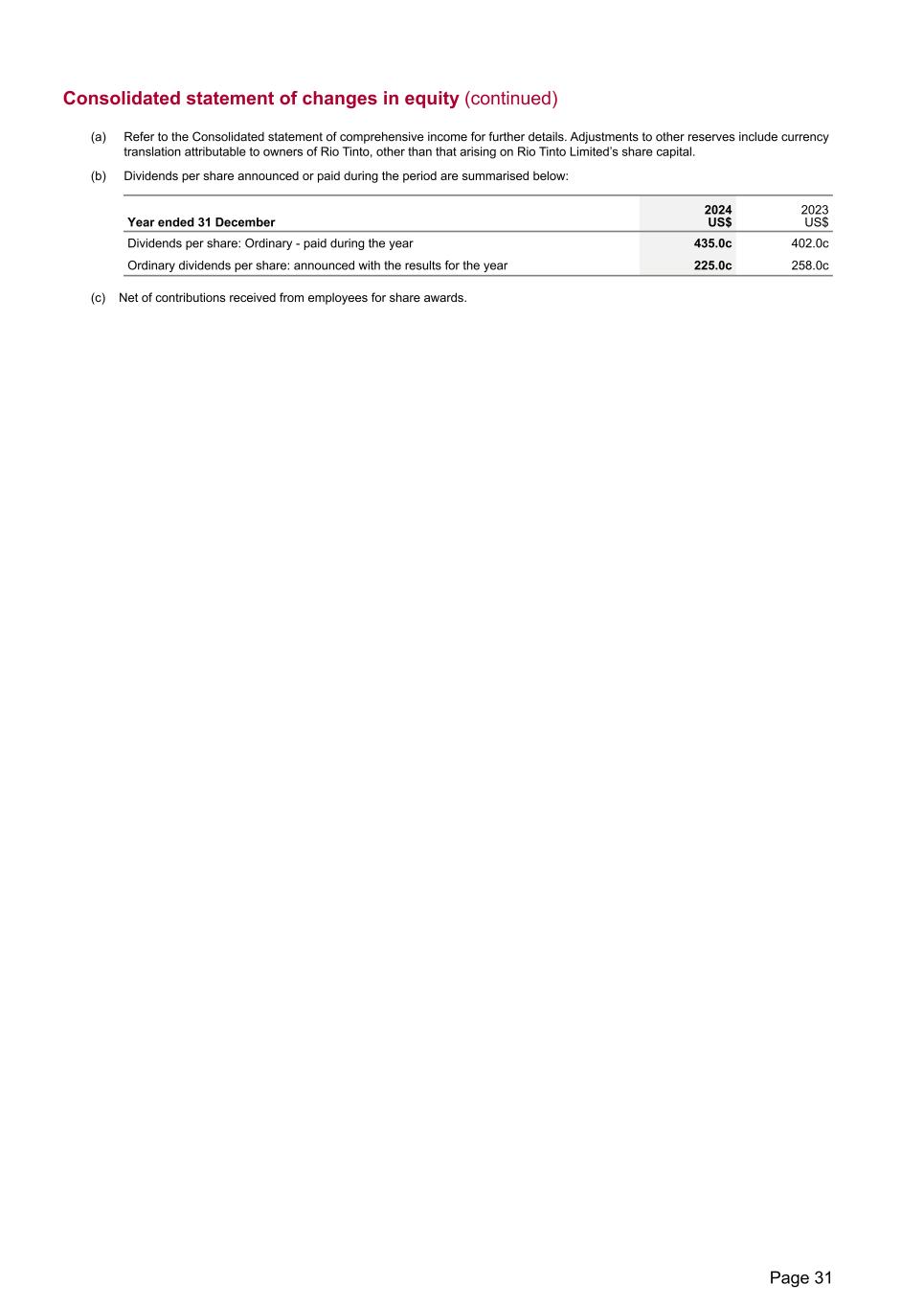 Consolidated statement of changes in equity (continued) (a) Refer to the Consolidated statement of comprehensive income for further details. Adjustments to other reserves include currency translation attributable to owners of Rio Tinto, other than that arising on Rio Tinto Limited’s share capital. (b) Dividends per share announced or paid during the period are summarised below: Year ended 31 December 2024 US$ 2023 US$ Dividends per share: Ordinary - paid during the year 435.0c 402.0c Ordinary dividends per share: announced with the results for the year 225.0c 258.0c (c) Net of contributions received from employees for share awards. Page 31