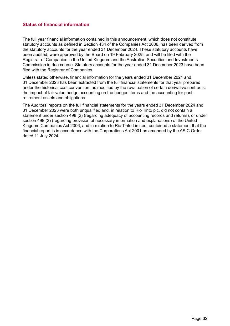 Status of financial information The full year financial information contained in this announcement, which does not constitute statutory accounts as defined in Section 434 of the Companies Act 2006, has been derived from the statutory accounts for the year ended 31 December 2024. These statutory accounts have been audited, were approved by the Board on 19 February 2025, and will be filed with the Registrar of Companies in the United Kingdom and the Australian Securities and Investments Commission in due course. Statutory accounts for the year ended 31 December 2023 have been filed with the Registrar of Companies. Unless stated otherwise, financial information for the years ended 31 December 2024 and 31 December 2023 has been extracted from the full financial statements for that year prepared under the historical cost convention, as modified by the revaluation of certain derivative contracts, the impact of fair value hedge accounting on the hedged items and the accounting for post- retirement assets and obligations. The Auditors' reports on the full financial statements for the years ended 31 December 2024 and 31 December 2023 were both unqualified and, in relation to Rio Tinto plc, did not contain a statement under section 498 (2) (regarding adequacy of accounting records and returns), or under section 498 (3) (regarding provision of necessary information and explanations) of the United Kingdom Companies Act 2006, and in relation to Rio Tinto Limited, contained a statement that the financial report is in accordance with the Corporations Act 2001 as amended by the ASIC Order dated 11 July 2024. Page 32