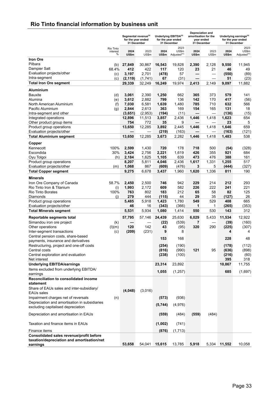 Rio Tinto financial information by business unit Segmental revenue(a) for the year ended 31 December Underlying EBITDA(a) for the year ended 31 December Depreciation and amortisation for the year ended 31 December Underlying earnings(a) for the year ended 31 December Rio Tinto interest % 2024 US$m 2023 US$m 2024 US$m 2023 US$m Adjusted(m) 2024 US$m 2023 US$m 2024 US$m 2023 US$m Adjusted(m) Iron Ore Pilbara (b) 27,849 30,867 16,543 19,828 2,390 2,128 9,550 11,945 Dampier Salt 68.4% 412 422 117 120 23 21 46 49 Evaluation projects/other (c) 3,197 2,701 (478) 57 — — (550) (89) Intra-segment (c) (2,119) (1,741) 67 (31) — — 51 (23) Total Iron Ore segment 29,339 32,249 16,249 19,974 2,413 2,149 9,097 11,882 Aluminium Bauxite (d) 3,061 2,390 1,250 662 365 373 579 141 Alumina (e) 3,612 2,882 799 136 142 170 417 (56) North American Aluminium (f) 7,030 6,581 1,639 1,480 785 710 632 566 Pacific Aluminium (g) 2,844 2,613 363 169 154 165 131 18 Intra-segment and other (3,651) (2,953) (194) (11) — — (136) (15) Integrated operations 12,896 11,513 3,857 2,436 1,446 1,418 1,623 654 Other product group items 754 772 35 9 — — 23 5 Product group operations 13,650 12,285 3,892 2,445 1,446 1,418 1,646 659 Evaluation projects/other — — (219) (163) — — (163) (121) Total Aluminium segment 13,650 12,285 3,673 2,282 1,446 1,418 1,483 538 Copper Kennecott 100% 2,599 1,430 720 178 718 500 (54) (328) Escondida 30% 3,424 2,756 2,221 1,619 426 355 921 684 Oyu Tolgoi (h) 2,184 1,625 1,105 639 473 476 388 161 Product group operations 8,207 5,811 4,046 2,436 1,617 1,331 1,255 517 Evaluation projects/other (m) 1,068 867 (609) (476) 3 5 (444) (327) Total Copper segment 9,275 6,678 3,437 1,960 1,620 1,336 811 190 Minerals Iron Ore Company of Canada 58.7% 2,450 2,500 746 942 229 214 212 293 Rio Tinto Iron & Titanium (i) 1,993 2,172 609 582 226 222 241 221 Rio Tinto Borates 100% 763 802 183 212 65 58 82 125 Diamonds (j) 279 444 (115) 44 29 35 (127) 26 Product group operations 5,485 5,918 1,423 1,780 549 529 408 665 Evaluation projects/other 46 16 (343) (366) 1 1 (265) (353) Total Minerals segment 5,531 5,934 1,080 1,414 550 530 143 312 Reportable segments total 57,795 57,146 24,439 25,630 6,029 5,433 11,534 12,922 Simandou iron ore project (k) — — (22) (539) 7 — (39) (160) Other operations (l)(m) 120 142 43 (95) 320 290 (225) (307) Inter-segment transactions (c) (209) (231) 9 8 4 4 Central pension costs, share-based payments, insurance and derivatives 153 168 228 48 Restructuring, project and one-off costs (254) (190) (178) (112) Central costs (816) (990) 121 95 (636) (898) Central exploration and evaluation (238) (100) (216) (60) Net interest 395 318 Underlying EBITDA/earnings 23,314 23,892 10,867 11,755 Items excluded from underlying EBITDA/ earnings 1,055 (1,257) 685 (1,697) Reconciliation to consolidated income statement Share of EAUs sales and inter-subsidiary/ EAUs sales (4,048) (3,016) Impairment charges net of reversals (n) (573) (936) Depreciation and amortisation in subsidiaries excluding capitalised depreciation (5,744) (4,976) Depreciation and amortisation in EAUs (559) (484) (559) (484) Taxation and finance items in EAUs (1,002) (741) Finance items (876) (1,713) Consolidated sales revenue/profit before taxation/depreciation and amortisation/net earnings 53,658 54,041 15,615 13,785 5,918 5,334 11,552 10,058 Page 33