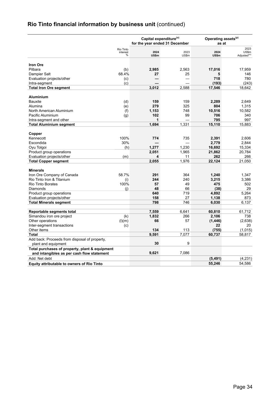 Rio Tinto financial information by business unit (continued) Capital expenditure(o) for the year ended 31 December Operating assets(p) as at Rio Tinto interest % 2024 US$m 2023 US$m 2024 US$m 2023 US$m Adjusted(m) Iron Ore Pilbara (b) 2,985 2,563 17,016 17,959 Dampier Salt 68.4% 27 25 5 146 Evaluation projects/other (c) — — 718 780 Intra-segment (c) — — (193) (243) Total Iron Ore segment 3,012 2,588 17,546 18,642 Aluminium Bauxite (d) 159 159 2,289 2,649 Alumina (e) 279 325 804 1,315 North American Aluminium (f) 1,153 748 10,516 10,582 Pacific Aluminium (g) 102 99 706 340 Intra-segment and other 1 — 795 997 Total Aluminium segment 1,694 1,331 15,110 15,883 Copper Kennecott 100% 774 735 2,391 2,606 Escondida 30% — — 2,779 2,844 Oyu Tolgoi (h) 1,277 1,230 16,692 15,334 Product group operations 2,051 1,965 21,862 20,784 Evaluation projects/other (m) 4 11 262 266 Total Copper segment 2,055 1,976 22,124 21,050 Minerals Iron Ore Company of Canada 58.7% 291 364 1,240 1,347 Rio Tinto Iron & Titanium (i) 244 240 3,215 3,386 Rio Tinto Borates 100% 57 49 475 502 Diamonds (j) 48 66 (38) 29 Product group operations 640 719 4,892 5,264 Evaluation projects/other 158 27 1,138 873 Total Minerals segment 798 746 6,030 6,137 Reportable segments total 7,559 6,641 60,810 61,712 Simandou iron ore project (k) 1,832 266 2,106 738 Other operations (l)(m) 66 57 (1,446) (2,638) Inter-segment transactions (c) 22 20 Other items 134 113 (755) (1,015) Total 9,591 7,077 60,737 58,817 Add back: Proceeds from disposal of property, plant and equipment 30 9 Total purchases of property, plant & equipment and intangibles as per cash flow statement 9,621 7,086 Add: Net debt (5,491) (4,231) Equity attributable to owners of Rio Tinto 55,246 54,586 Page 34