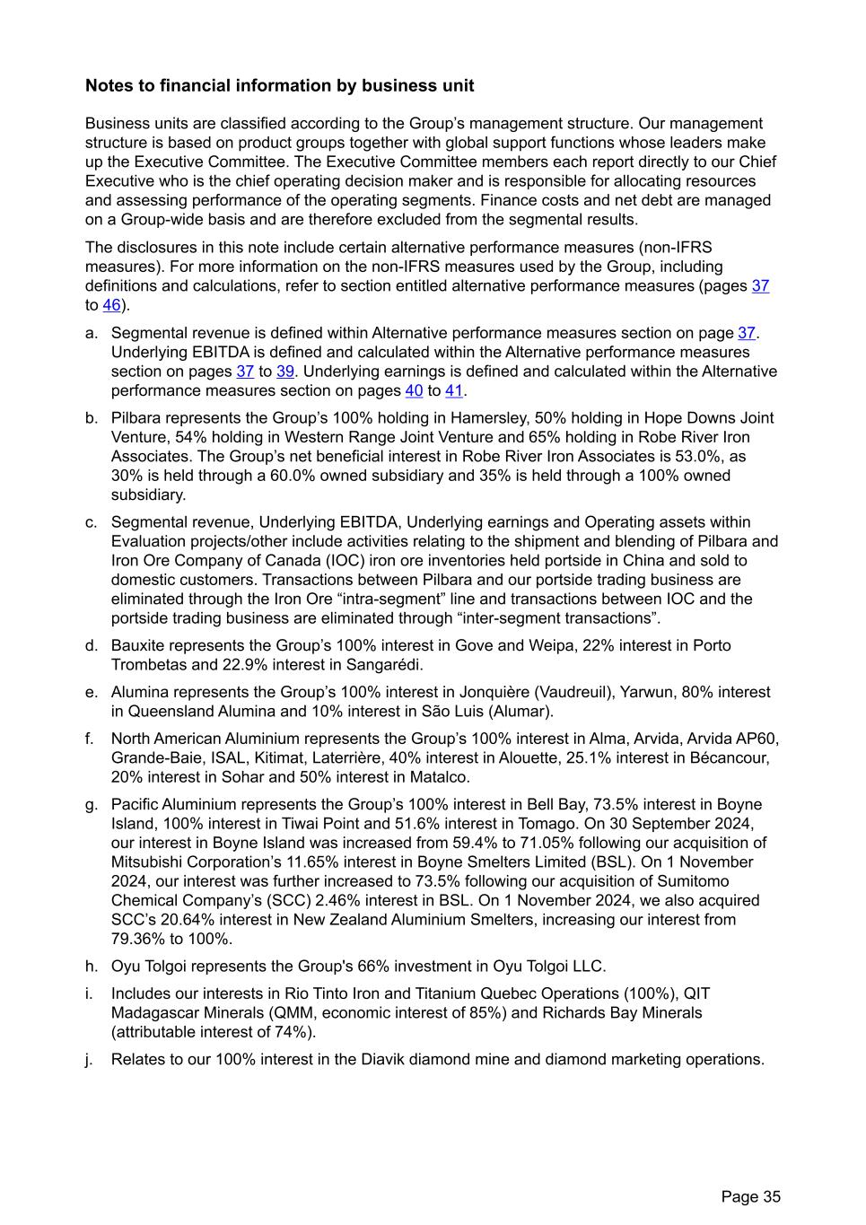 Notes to financial information by business unit Business units are classified according to the Group’s management structure. Our management structure is based on product groups together with global support functions whose leaders make up the Executive Committee. The Executive Committee members each report directly to our Chief Executive who is the chief operating decision maker and is responsible for allocating resources and assessing performance of the operating segments. Finance costs and net debt are managed on a Group-wide basis and are therefore excluded from the segmental results. The disclosures in this note include certain alternative performance measures (non-IFRS measures). For more information on the non-IFRS measures used by the Group, including definitions and calculations, refer to section entitled alternative performance measures (pages 37 to 46). a. Segmental revenue is defined within Alternative performance measures section on page 37. Underlying EBITDA is defined and calculated within the Alternative performance measures section on pages 37 to 39. Underlying earnings is defined and calculated within the Alternative performance measures section on pages 40 to 41. b. Pilbara represents the Group’s 100% holding in Hamersley, 50% holding in Hope Downs Joint Venture, 54% holding in Western Range Joint Venture and 65% holding in Robe River Iron Associates. The Group’s net beneficial interest in Robe River Iron Associates is 53.0%, as 30% is held through a 60.0% owned subsidiary and 35% is held through a 100% owned subsidiary. c. Segmental revenue, Underlying EBITDA, Underlying earnings and Operating assets within Evaluation projects/other include activities relating to the shipment and blending of Pilbara and Iron Ore Company of Canada (IOC) iron ore inventories held portside in China and sold to domestic customers. Transactions between Pilbara and our portside trading business are eliminated through the Iron Ore “intra-segment” line and transactions between IOC and the portside trading business are eliminated through “inter-segment transactions”. d. Bauxite represents the Group’s 100% interest in Gove and Weipa, 22% interest in Porto Trombetas and 22.9% interest in Sangarédi. e. Alumina represents the Group’s 100% interest in Jonquière (Vaudreuil), Yarwun, 80% interest in Queensland Alumina and 10% interest in São Luis (Alumar). f. North American Aluminium represents the Group’s 100% interest in Alma, Arvida, Arvida AP60, Grande-Baie, ISAL, Kitimat, Laterrière, 40% interest in Alouette, 25.1% interest in Bécancour, 20% interest in Sohar and 50% interest in Matalco. g. Pacific Aluminium represents the Group’s 100% interest in Bell Bay, 73.5% interest in Boyne Island, 100% interest in Tiwai Point and 51.6% interest in Tomago. On 30 September 2024, our interest in Boyne Island was increased from 59.4% to 71.05% following our acquisition of Mitsubishi Corporation’s 11.65% interest in Boyne Smelters Limited (BSL). On 1 November 2024, our interest was further increased to 73.5% following our acquisition of Sumitomo Chemical Company’s (SCC) 2.46% interest in BSL. On 1 November 2024, we also acquired SCC’s 20.64% interest in New Zealand Aluminium Smelters, increasing our interest from 79.36% to 100%. h. Oyu Tolgoi represents the Group's 66% investment in Oyu Tolgoi LLC. i. Includes our interests in Rio Tinto Iron and Titanium Quebec Operations (100%), QIT Madagascar Minerals (QMM, economic interest of 85%) and Richards Bay Minerals (attributable interest of 74%). j. Relates to our 100% interest in the Diavik diamond mine and diamond marketing operations. Page 35