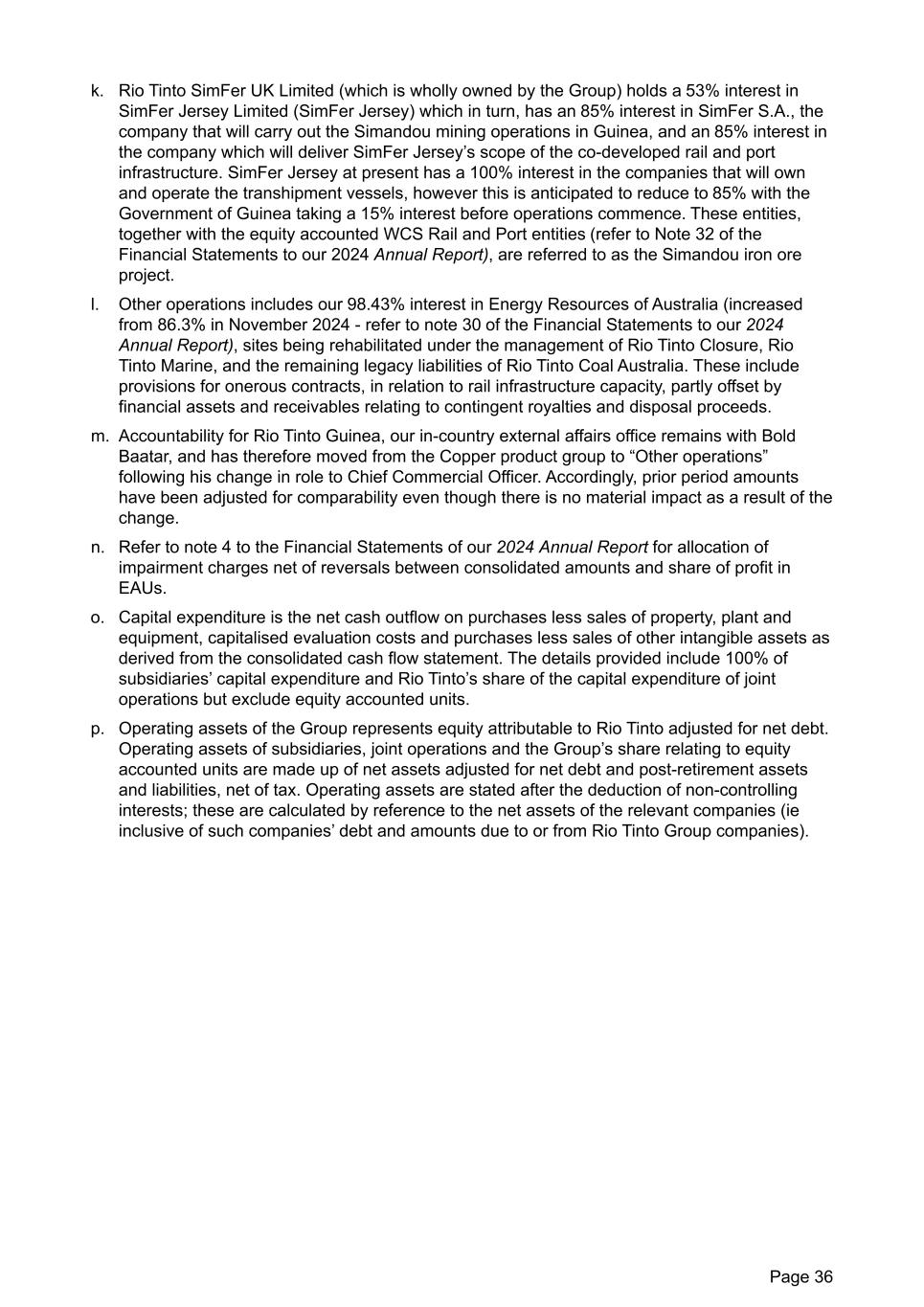 k. Rio Tinto SimFer UK Limited (which is wholly owned by the Group) holds a 53% interest in SimFer Jersey Limited (SimFer Jersey) which in turn, has an 85% interest in SimFer S.A., the company that will carry out the Simandou mining operations in Guinea, and an 85% interest in the company which will deliver SimFer Jersey’s scope of the co-developed rail and port infrastructure. SimFer Jersey at present has a 100% interest in the companies that will own and operate the transhipment vessels, however this is anticipated to reduce to 85% with the Government of Guinea taking a 15% interest before operations commence. These entities, together with the equity accounted WCS Rail and Port entities (refer to Note 32 of the Financial Statements to our 2024 Annual Report), are referred to as the Simandou iron ore project. l. Other operations includes our 98.43% interest in Energy Resources of Australia (increased from 86.3% in November 2024 - refer to note 30 of the Financial Statements to our 2024 Annual Report), sites being rehabilitated under the management of Rio Tinto Closure, Rio Tinto Marine, and the remaining legacy liabilities of Rio Tinto Coal Australia. These include provisions for onerous contracts, in relation to rail infrastructure capacity, partly offset by financial assets and receivables relating to contingent royalties and disposal proceeds. m. Accountability for Rio Tinto Guinea, our in-country external affairs office remains with Bold Baatar, and has therefore moved from the Copper product group to “Other operations” following his change in role to Chief Commercial Officer. Accordingly, prior period amounts have been adjusted for comparability even though there is no material impact as a result of the change. n. Refer to note 4 to the Financial Statements of our 2024 Annual Report for allocation of impairment charges net of reversals between consolidated amounts and share of profit in EAUs. o. Capital expenditure is the net cash outflow on purchases less sales of property, plant and equipment, capitalised evaluation costs and purchases less sales of other intangible assets as derived from the consolidated cash flow statement. The details provided include 100% of subsidiaries’ capital expenditure and Rio Tinto’s share of the capital expenditure of joint operations but exclude equity accounted units. p. Operating assets of the Group represents equity attributable to Rio Tinto adjusted for net debt. Operating assets of subsidiaries, joint operations and the Group’s share relating to equity accounted units are made up of net assets adjusted for net debt and post-retirement assets and liabilities, net of tax. Operating assets are stated after the deduction of non-controlling interests; these are calculated by reference to the net assets of the relevant companies (ie inclusive of such companies’ debt and amounts due to or from Rio Tinto Group companies). Page 36