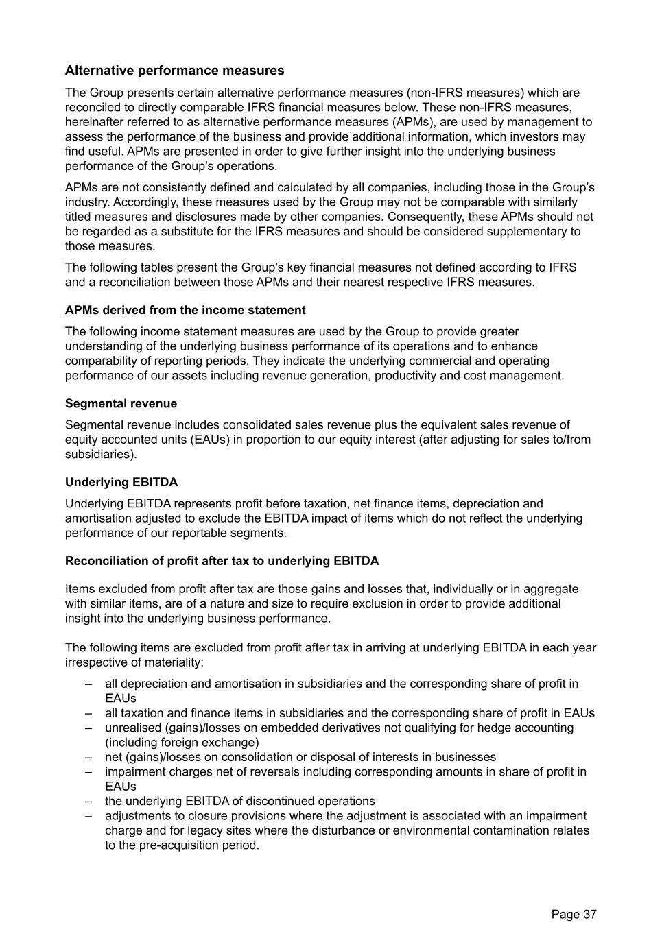 Alternative performance measures The Group presents certain alternative performance measures (non-IFRS measures) which are reconciled to directly comparable IFRS financial measures below. These non-IFRS measures, hereinafter referred to as alternative performance measures (APMs), are used by management to assess the performance of the business and provide additional information, which investors may find useful. APMs are presented in order to give further insight into the underlying business performance of the Group's operations. APMs are not consistently defined and calculated by all companies, including those in the Group’s industry. Accordingly, these measures used by the Group may not be comparable with similarly titled measures and disclosures made by other companies. Consequently, these APMs should not be regarded as a substitute for the IFRS measures and should be considered supplementary to those measures. The following tables present the Group's key financial measures not defined according to IFRS and a reconciliation between those APMs and their nearest respective IFRS measures. APMs derived from the income statement The following income statement measures are used by the Group to provide greater understanding of the underlying business performance of its operations and to enhance comparability of reporting periods. They indicate the underlying commercial and operating performance of our assets including revenue generation, productivity and cost management. Segmental revenue Segmental revenue includes consolidated sales revenue plus the equivalent sales revenue of equity accounted units (EAUs) in proportion to our equity interest (after adjusting for sales to/from subsidiaries). Underlying EBITDA Underlying EBITDA represents profit before taxation, net finance items, depreciation and amortisation adjusted to exclude the EBITDA impact of items which do not reflect the underlying performance of our reportable segments. Reconciliation of profit after tax to underlying EBITDA Items excluded from profit after tax are those gains and losses that, individually or in aggregate with similar items, are of a nature and size to require exclusion in order to provide additional insight into the underlying business performance. The following items are excluded from profit after tax in arriving at underlying EBITDA in each year irrespective of materiality: – all depreciation and amortisation in subsidiaries and the corresponding share of profit in EAUs – all taxation and finance items in subsidiaries and the corresponding share of profit in EAUs – unrealised (gains)/losses on embedded derivatives not qualifying for hedge accounting (including foreign exchange) – net (gains)/losses on consolidation or disposal of interests in businesses – impairment charges net of reversals including corresponding amounts in share of profit in EAUs – the underlying EBITDA of discontinued operations – adjustments to closure provisions where the adjustment is associated with an impairment charge and for legacy sites where the disturbance or environmental contamination relates to the pre-acquisition period. Page 37