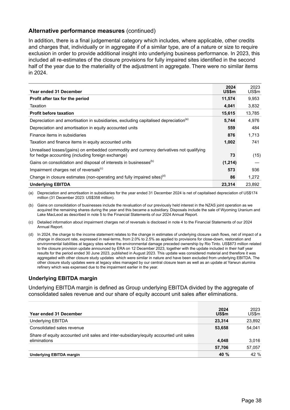 Alternative performance measures (continued) In addition, there is a final judgemental category which includes, where applicable, other credits and charges that, individually or in aggregate if of a similar type, are of a nature or size to require exclusion in order to provide additional insight into underlying business performance. In 2023, this included all re-estimates of the closure provisions for fully impaired sites identified in the second half of the year due to the materiality of the adjustment in aggregate. There were no similar items in 2024. Year ended 31 December 2024 US$m 2023 US$m Profit after tax for the period 11,574 9,953 Taxation 4,041 3,832 Profit before taxation 15,615 13,785 Depreciation and amortisation in subsidiaries, excluding capitalised depreciation(a) 5,744 4,976 Depreciation and amortisation in equity accounted units 559 484 Finance items in subsidiaries 876 1,713 Taxation and finance items in equity accounted units 1,002 741 Unrealised losses/(gains) on embedded commodity and currency derivatives not qualifying for hedge accounting (including foreign exchange) 73 (15) Gains on consolidation and disposal of interests in businesses(b) (1,214) — Impairment charges net of reversals(c) 573 936 Change in closure estimates (non-operating and fully impaired sites)(d) 86 1,272 Underlying EBITDA 23,314 23,892 (a) Depreciation and amortisation in subsidiaries for the year ended 31 December 2024 is net of capitalised depreciation of US$174 million (31 December 2023: US$358 million). (b) Gains on consolidation of businesses include the revaluation of our previously held interest in the NZAS joint operation as we acquired the remaining shares during the year and this became a subsidiary. Disposals include the sale of Wyoming Uranium and Lake MacLeod as described in note 5 to the Financial Statements of our 2024 Annual Report. (c) Detailed information about impairment charges net of reversals is disclosed in note 4 to the Financial Statements of our 2024 Annual Report. (d) In 2024, the charge to the income statement relates to the change in estimates of underlying closure cash flows, net of impact of a change in discount rate, expressed in real-terms, from 2.0% to 2.5% as applied to provisions for close-down, restoration and environmental liabilities at legacy sites where the environmental damage preceded ownership by Rio Tinto. US$873 million related to the closure provision update announced by ERA on 12 December 2023, together with the update included in their half year results for the period ended 30 June 2023, published in August 2023. This update was considered material and therefore it was aggregated with other closure study updates which were similar in nature and have been excluded from underlying EBITDA. The other closure study updates were at legacy sites managed by our central closure team as well as an update at Yarwun alumina refinery which was expensed due to the impairment earlier in the year. Underlying EBITDA margin Underlying EBITDA margin is defined as Group underlying EBITDA divided by the aggregate of consolidated sales revenue and our share of equity account unit sales after eliminations. Year ended 31 December 2024 US$m 2023 US$m Underlying EBITDA 23,314 23,892 Consolidated sales revenue 53,658 54,041 Share of equity accounted unit sales and inter-subsidiary/equity accounted unit sales eliminations 4,048 3,016 57,706 57,057 Underlying EBITDA margin 40 % 42 % Page 38