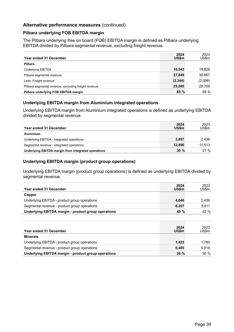 Alternative performance measures (continued) Pilbara underlying FOB EBITDA margin The Pilbara underlying free on board (FOB) EBITDA margin is defined as Pilbara underlying EBITDA divided by Pilbara segmental revenue, excluding freight revenue. Year ended 31 December 2024 US$m 2023 US$m Pilbara Underlying EBITDA 16,543 19,828 Pilbara segmental revenue 27,849 30,867 Less: Freight revenue (2,344) (2,098) Pilbara segmental revenue, excluding freight revenue 25,505 28,769 Pilbara underlying FOB EBITDA margin 65 % 69 % Underlying EBITDA margin from Aluminium integrated operations Underlying EBITDA margin from Aluminium integrated operations is defined as underlying EBITDA divided by segmental revenue. Year ended 31 December 2024 US$m 2023 US$m Aluminium Underlying EBITDA - integrated operations 3,857 2,436 Segmental revenue - integrated operations 12,896 11,513 Underlying EBITDA margin from integrated operations 30 % 21 % Underlying EBITDA margin (product group operations) Underlying EBITDA margin (product group operations) is defined as underlying EBITDA divided by segmental revenue. Year ended 31 December 2024 US$m 2023 US$m Copper Underlying EBITDA - product group operations 4,046 2,436 Segmental revenue - product group operations 8,207 5,811 Underlying EBITDA margin - product group operations 49 % 42 % Year ended 31 December 2024 US$m 2023 US$m Minerals Underlying EBITDA - product group operations 1,423 1,780 Segmental revenue - product group operations 5,485 5,918 Underlying EBITDA margin - product group operations 26 % 30 % Page 39