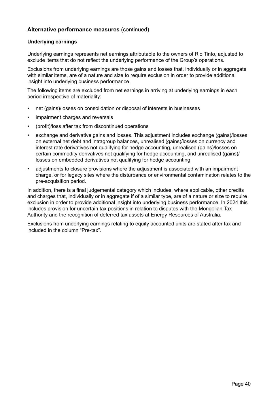 Alternative performance measures (continued) Underlying earnings Underlying earnings represents net earnings attributable to the owners of Rio Tinto, adjusted to exclude items that do not reflect the underlying performance of the Group’s operations. Exclusions from underlying earnings are those gains and losses that, individually or in aggregate with similar items, are of a nature and size to require exclusion in order to provide additional insight into underlying business performance. The following items are excluded from net earnings in arriving at underlying earnings in each period irrespective of materiality: • net (gains)/losses on consolidation or disposal of interests in businesses • impairment charges and reversals • (profit)/loss after tax from discontinued operations • exchange and derivative gains and losses. This adjustment includes exchange (gains)/losses on external net debt and intragroup balances, unrealised (gains)/losses on currency and interest rate derivatives not qualifying for hedge accounting, unrealised (gains)/losses on certain commodity derivatives not qualifying for hedge accounting, and unrealised (gains)/ losses on embedded derivatives not qualifying for hedge accounting • adjustments to closure provisions where the adjustment is associated with an impairment charge, or for legacy sites where the disturbance or environmental contamination relates to the pre-acquisition period. In addition, there is a final judgemental category which includes, where applicable, other credits and charges that, individually or in aggregate if of a similar type, are of a nature or size to require exclusion in order to provide additional insight into underlying business performance. In 2024 this includes provision for uncertain tax positions in relation to disputes with the Mongolian Tax Authority and the recognition of deferred tax assets at Energy Resources of Australia. Exclusions from underlying earnings relating to equity accounted units are stated after tax and included in the column “Pre-tax”. Page 40