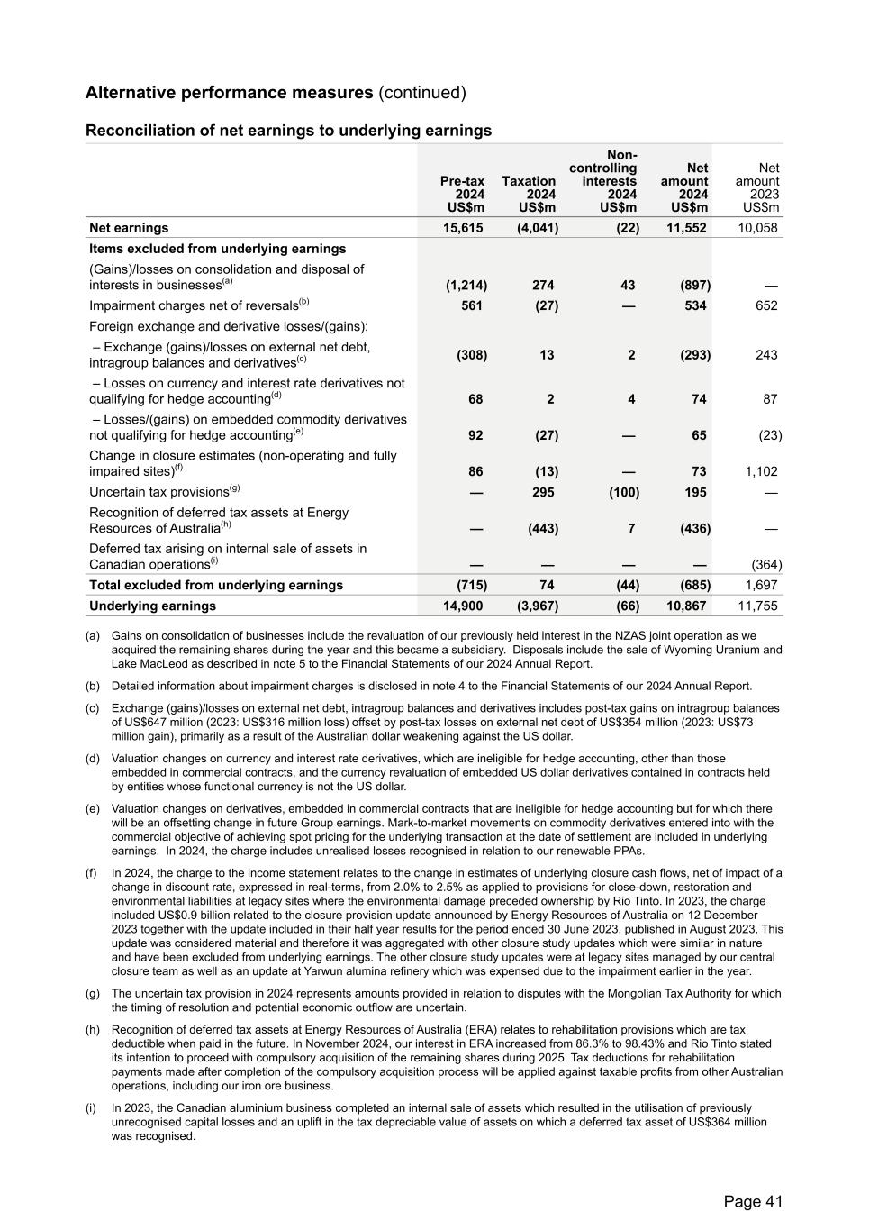 Alternative performance measures (continued) Reconciliation of net earnings to underlying earnings Pre-tax 2024 US$m Taxation 2024 US$m Non- controlling interests 2024 US$m Net amount 2024 US$m Net amount 2023 US$m Net earnings 15,615 (4,041) (22) 11,552 10,058 Items excluded from underlying earnings (Gains)/losses on consolidation and disposal of interests in businesses(a) (1,214) 274 43 (897) — Impairment charges net of reversals(b) 561 (27) — 534 652 Foreign exchange and derivative losses/(gains): – Exchange (gains)/losses on external net debt, intragroup balances and derivatives(c) (308) 13 2 (293) 243 – Losses on currency and interest rate derivatives not qualifying for hedge accounting(d) 68 2 4 74 87 – Losses/(gains) on embedded commodity derivatives not qualifying for hedge accounting(e) 92 (27) — 65 (23) Change in closure estimates (non-operating and fully impaired sites)(f) 86 (13) — 73 1,102 Uncertain tax provisions(g) — 295 (100) 195 — Recognition of deferred tax assets at Energy Resources of Australia(h) — (443) 7 (436) — Deferred tax arising on internal sale of assets in Canadian operations(i) — — — — (364) Total excluded from underlying earnings (715) 74 (44) (685) 1,697 Underlying earnings 14,900 (3,967) (66) 10,867 11,755 (a) Gains on consolidation of businesses include the revaluation of our previously held interest in the NZAS joint operation as we acquired the remaining shares during the year and this became a subsidiary. Disposals include the sale of Wyoming Uranium and Lake MacLeod as described in note 5 to the Financial Statements of our 2024 Annual Report. (b) Detailed information about impairment charges is disclosed in note 4 to the Financial Statements of our 2024 Annual Report. (c) Exchange (gains)/losses on external net debt, intragroup balances and derivatives includes post-tax gains on intragroup balances of US$647 million (2023: US$316 million loss) offset by post-tax losses on external net debt of US$354 million (2023: US$73 million gain), primarily as a result of the Australian dollar weakening against the US dollar. (d) Valuation changes on currency and interest rate derivatives, which are ineligible for hedge accounting, other than those embedded in commercial contracts, and the currency revaluation of embedded US dollar derivatives contained in contracts held by entities whose functional currency is not the US dollar. (e) Valuation changes on derivatives, embedded in commercial contracts that are ineligible for hedge accounting but for which there will be an offsetting change in future Group earnings. Mark-to-market movements on commodity derivatives entered into with the commercial objective of achieving spot pricing for the underlying transaction at the date of settlement are included in underlying earnings. In 2024, the charge includes unrealised losses recognised in relation to our renewable PPAs. (f) In 2024, the charge to the income statement relates to the change in estimates of underlying closure cash flows, net of impact of a change in discount rate, expressed in real-terms, from 2.0% to 2.5% as applied to provisions for close-down, restoration and environmental liabilities at legacy sites where the environmental damage preceded ownership by Rio Tinto. In 2023, the charge included US$0.9 billion related to the closure provision update announced by Energy Resources of Australia on 12 December 2023 together with the update included in their half year results for the period ended 30 June 2023, published in August 2023. This update was considered material and therefore it was aggregated with other closure study updates which were similar in nature and have been excluded from underlying earnings. The other closure study updates were at legacy sites managed by our central closure team as well as an update at Yarwun alumina refinery which was expensed due to the impairment earlier in the year. (g) The uncertain tax provision in 2024 represents amounts provided in relation to disputes with the Mongolian Tax Authority for which the timing of resolution and potential economic outflow are uncertain. (h) Recognition of deferred tax assets at Energy Resources of Australia (ERA) relates to rehabilitation provisions which are tax deductible when paid in the future. In November 2024, our interest in ERA increased from 86.3% to 98.43% and Rio Tinto stated its intention to proceed with compulsory acquisition of the remaining shares during 2025. Tax deductions for rehabilitation payments made after completion of the compulsory acquisition process will be applied against taxable profits from other Australian operations, including our iron ore business. (i) In 2023, the Canadian aluminium business completed an internal sale of assets which resulted in the utilisation of previously unrecognised capital losses and an uplift in the tax depreciable value of assets on which a deferred tax asset of US$364 million was recognised. Page 41