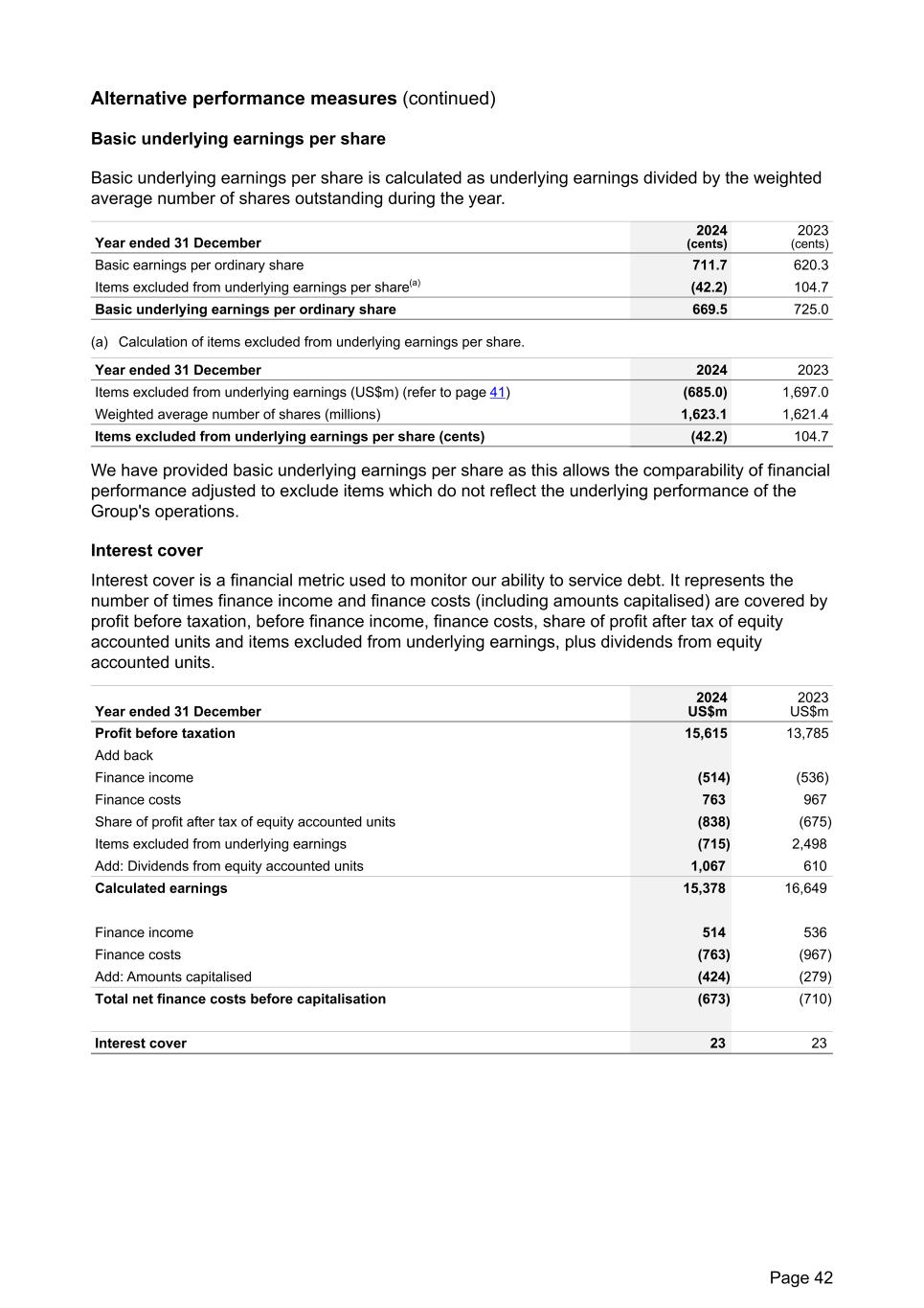 Alternative performance measures (continued) Basic underlying earnings per share Basic underlying earnings per share is calculated as underlying earnings divided by the weighted average number of shares outstanding during the year. Year ended 31 December 2024 (cents) 2023 (cents) Basic earnings per ordinary share 711.7 620.3 Items excluded from underlying earnings per share(a) (42.2) 104.7 Basic underlying earnings per ordinary share 669.5 725.0 (a) Calculation of items excluded from underlying earnings per share. Year ended 31 December 2024 2023 Items excluded from underlying earnings (US$m) (refer to page 41) (685.0) 1,697.0 Weighted average number of shares (millions) 1,623.1 1,621.4 Items excluded from underlying earnings per share (cents) (42.2) 104.7 We have provided basic underlying earnings per share as this allows the comparability of financial performance adjusted to exclude items which do not reflect the underlying performance of the Group's operations. Interest cover Interest cover is a financial metric used to monitor our ability to service debt. It represents the number of times finance income and finance costs (including amounts capitalised) are covered by profit before taxation, before finance income, finance costs, share of profit after tax of equity accounted units and items excluded from underlying earnings, plus dividends from equity accounted units. Year ended 31 December 2024 US$m 2023 US$m Profit before taxation 15,615 13,785 Add back Finance income (514) (536) Finance costs 763 967 Share of profit after tax of equity accounted units (838) (675) Items excluded from underlying earnings (715) 2,498 Add: Dividends from equity accounted units 1,067 610 Calculated earnings 15,378 16,649 Finance income 514 536 Finance costs (763) (967) Add: Amounts capitalised (424) (279) Total net finance costs before capitalisation (673) (710) Interest cover 23 23 Page 42