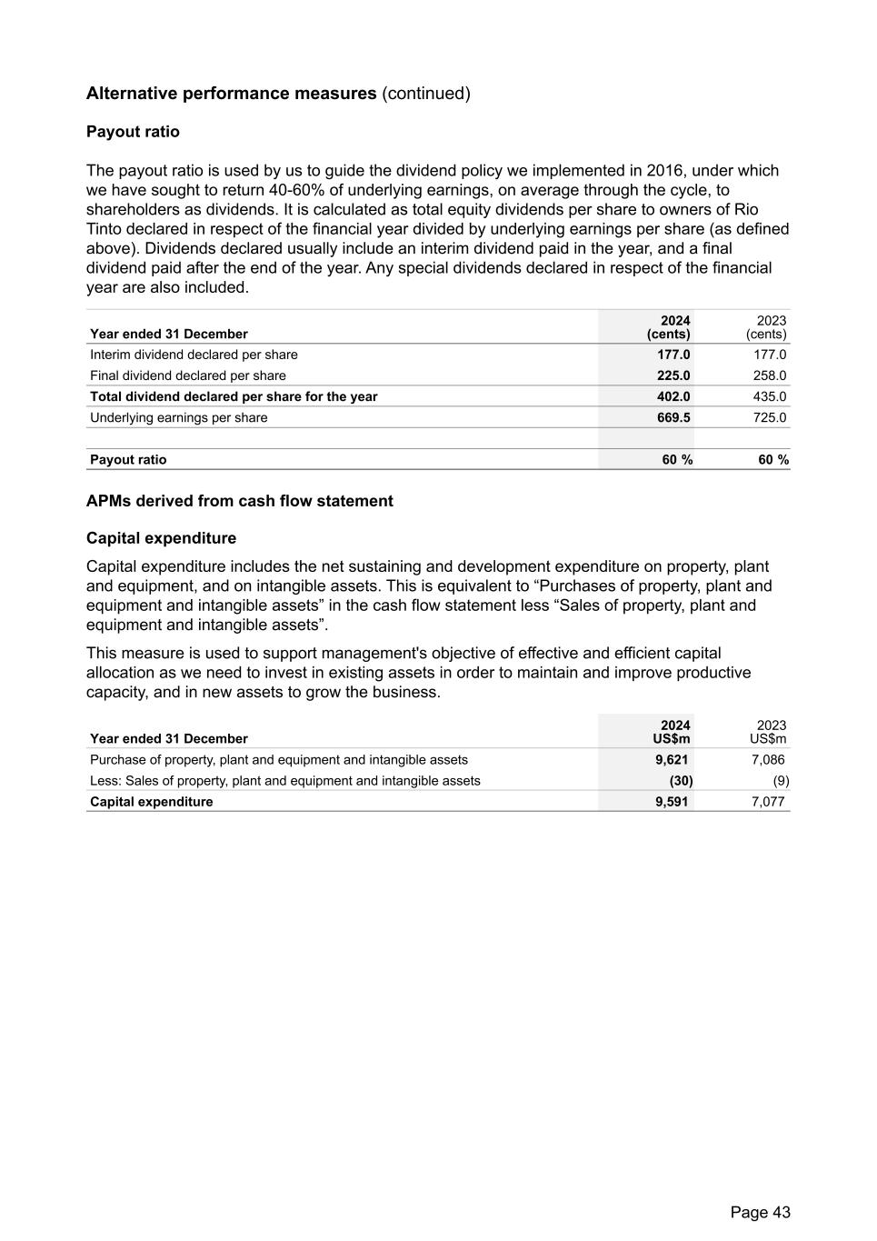 Alternative performance measures (continued) Payout ratio The payout ratio is used by us to guide the dividend policy we implemented in 2016, under which we have sought to return 40-60% of underlying earnings, on average through the cycle, to shareholders as dividends. It is calculated as total equity dividends per share to owners of Rio Tinto declared in respect of the financial year divided by underlying earnings per share (as defined above). Dividends declared usually include an interim dividend paid in the year, and a final dividend paid after the end of the year. Any special dividends declared in respect of the financial year are also included. Year ended 31 December 2024 (cents) 2023 (cents) Interim dividend declared per share 177.0 177.0 Final dividend declared per share 225.0 258.0 Total dividend declared per share for the year 402.0 435.0 Underlying earnings per share 669.5 725.0 Payout ratio 60 % 60 % APMs derived from cash flow statement Capital expenditure Capital expenditure includes the net sustaining and development expenditure on property, plant and equipment, and on intangible assets. This is equivalent to “Purchases of property, plant and equipment and intangible assets” in the cash flow statement less “Sales of property, plant and equipment and intangible assets”. This measure is used to support management's objective of effective and efficient capital allocation as we need to invest in existing assets in order to maintain and improve productive capacity, and in new assets to grow the business. Year ended 31 December 2024 US$m 2023 US$m Purchase of property, plant and equipment and intangible assets 9,621 7,086 Less: Sales of property, plant and equipment and intangible assets (30) (9) Capital expenditure 9,591 7,077 Page 43