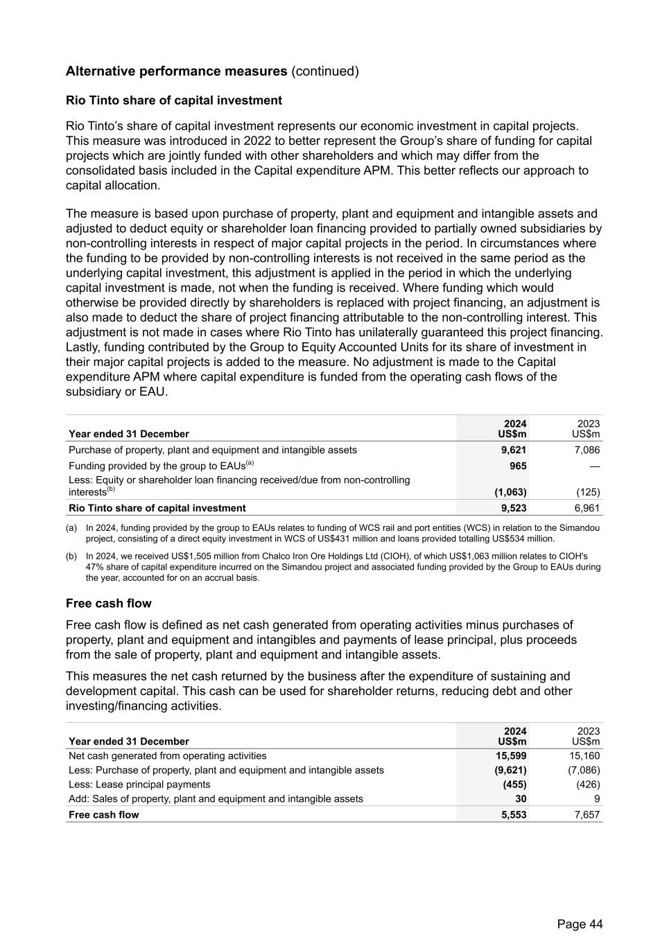 Alternative performance measures (continued) Rio Tinto share of capital investment Rio Tinto’s share of capital investment represents our economic investment in capital projects. This measure was introduced in 2022 to better represent the Group’s share of funding for capital projects which are jointly funded with other shareholders and which may differ from the consolidated basis included in the Capital expenditure APM. This better reflects our approach to capital allocation. The measure is based upon purchase of property, plant and equipment and intangible assets and adjusted to deduct equity or shareholder loan financing provided to partially owned subsidiaries by non-controlling interests in respect of major capital projects in the period. In circumstances where the funding to be provided by non-controlling interests is not received in the same period as the underlying capital investment, this adjustment is applied in the period in which the underlying capital investment is made, not when the funding is received. Where funding which would otherwise be provided directly by shareholders is replaced with project financing, an adjustment is also made to deduct the share of project financing attributable to the non-controlling interest. This adjustment is not made in cases where Rio Tinto has unilaterally guaranteed this project financing. Lastly, funding contributed by the Group to Equity Accounted Units for its share of investment in their major capital projects is added to the measure. No adjustment is made to the Capital expenditure APM where capital expenditure is funded from the operating cash flows of the subsidiary or EAU. Year ended 31 December 2024 US$m 2023 US$m Purchase of property, plant and equipment and intangible assets 9,621 7,086 Funding provided by the group to EAUs(a) 965 — Less: Equity or shareholder loan financing received/due from non-controlling interests(b) (1,063) (125) Rio Tinto share of capital investment 9,523 6,961 (a) In 2024, funding provided by the group to EAUs relates to funding of WCS rail and port entities (WCS) in relation to the Simandou project, consisting of a direct equity investment in WCS of US$431 million and loans provided totalling US$534 million. (b) In 2024, we received US$1,505 million from Chalco Iron Ore Holdings Ltd (CIOH), of which US$1,063 million relates to CIOH's 47% share of capital expenditure incurred on the Simandou project and associated funding provided by the Group to EAUs during the year, accounted for on an accrual basis. Free cash flow Free cash flow is defined as net cash generated from operating activities minus purchases of property, plant and equipment and intangibles and payments of lease principal, plus proceeds from the sale of property, plant and equipment and intangible assets. This measures the net cash returned by the business after the expenditure of sustaining and development capital. This cash can be used for shareholder returns, reducing debt and other investing/financing activities. Year ended 31 December 2024 US$m 2023 US$m Net cash generated from operating activities 15,599 15,160 Less: Purchase of property, plant and equipment and intangible assets (9,621) (7,086) Less: Lease principal payments (455) (426) Add: Sales of property, plant and equipment and intangible assets 30 9 Free cash flow 5,553 7,657 Page 44