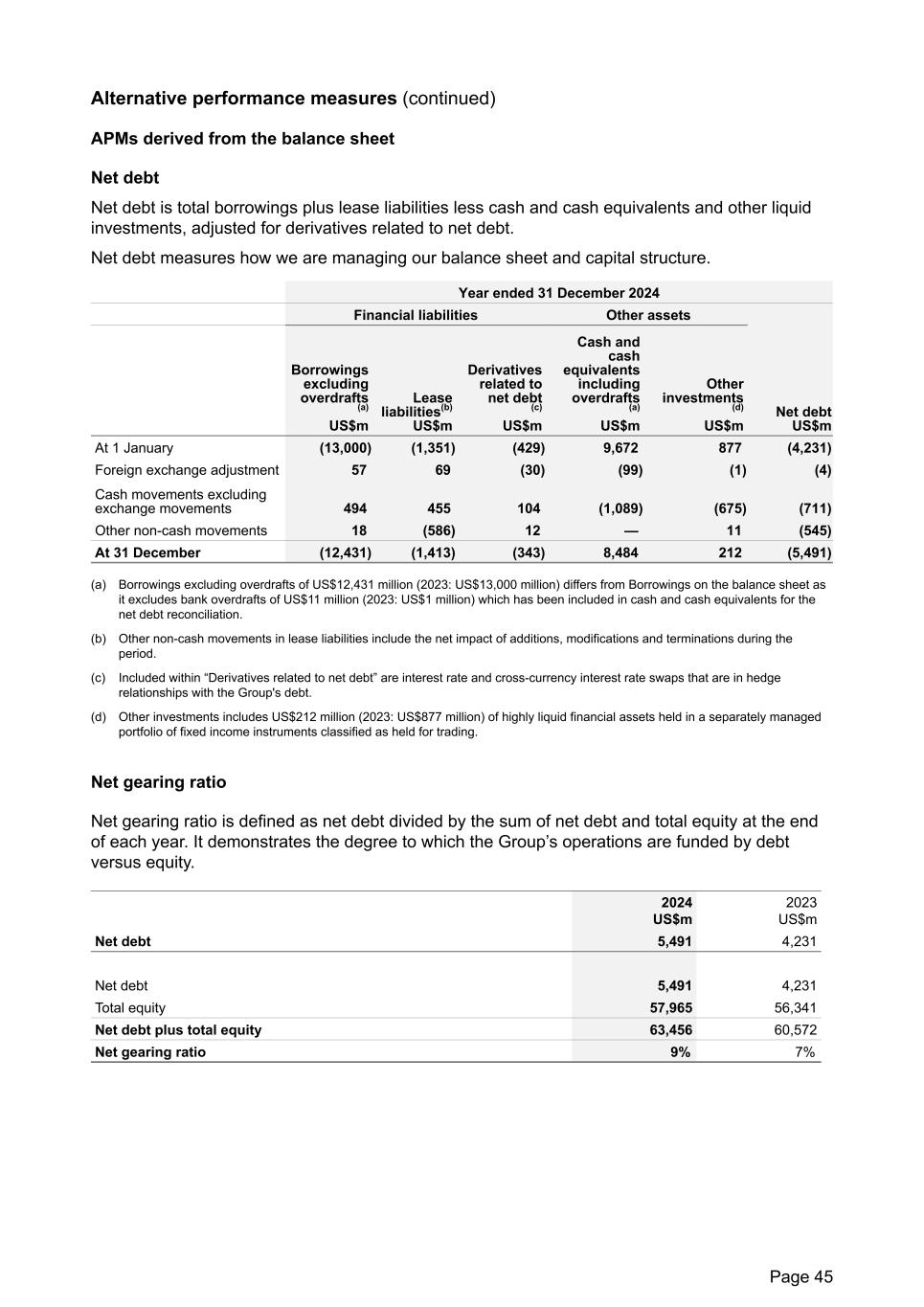 Alternative performance measures (continued) APMs derived from the balance sheet Net debt Net debt is total borrowings plus lease liabilities less cash and cash equivalents and other liquid investments, adjusted for derivatives related to net debt. Net debt measures how we are managing our balance sheet and capital structure. Year ended 31 December 2024 Financial liabilities Other assets Borrowings excluding overdrafts (a) US$m Lease liabilities(b) US$m Derivatives related to net debt (c) US$m Cash and cash equivalents including overdrafts (a) US$m Other investments (d) US$m Net debt US$m At 1 January (13,000) (1,351) (429) 9,672 877 (4,231) Foreign exchange adjustment 57 69 (30) (99) (1) (4) Cash movements excluding exchange movements 494 455 104 (1,089) (675) (711) Other non-cash movements 18 (586) 12 — 11 (545) At 31 December (12,431) (1,413) (343) 8,484 212 (5,491) (a) Borrowings excluding overdrafts of US$12,431 million (2023: US$13,000 million) differs from Borrowings on the balance sheet as it excludes bank overdrafts of US$11 million (2023: US$1 million) which has been included in cash and cash equivalents for the net debt reconciliation. (b) Other non-cash movements in lease liabilities include the net impact of additions, modifications and terminations during the period. (c) Included within “Derivatives related to net debt” are interest rate and cross-currency interest rate swaps that are in hedge relationships with the Group's debt. (d) Other investments includes US$212 million (2023: US$877 million) of highly liquid financial assets held in a separately managed portfolio of fixed income instruments classified as held for trading. Net gearing ratio Net gearing ratio is defined as net debt divided by the sum of net debt and total equity at the end of each year. It demonstrates the degree to which the Group’s operations are funded by debt versus equity. 2024 US$m 2023 US$m Net debt 5,491 4,231 Net debt 5,491 4,231 Total equity 57,965 56,341 Net debt plus total equity 63,456 60,572 Net gearing ratio 9% 7% Page 45