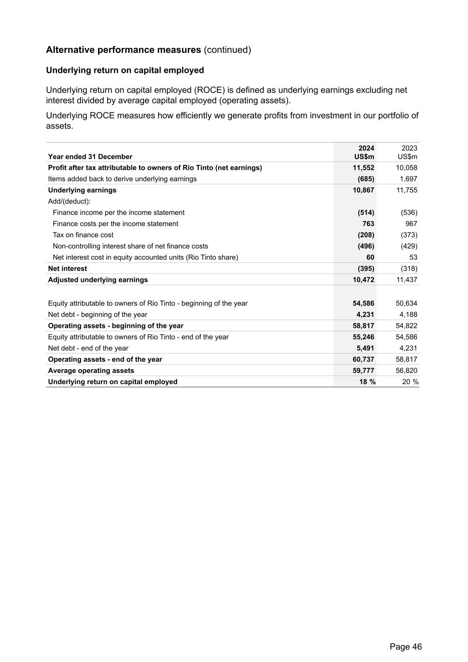 Alternative performance measures (continued) Underlying return on capital employed Underlying return on capital employed (ROCE) is defined as underlying earnings excluding net interest divided by average capital employed (operating assets). Underlying ROCE measures how efficiently we generate profits from investment in our portfolio of assets. Year ended 31 December 2024 US$m 2023 US$m Profit after tax attributable to owners of Rio Tinto (net earnings) 11,552 10,058 Items added back to derive underlying earnings (685) 1,697 Underlying earnings 10,867 11,755 Add/(deduct): Finance income per the income statement (514) (536) Finance costs per the income statement 763 967 Tax on finance cost (208) (373) Non-controlling interest share of net finance costs (496) (429) Net interest cost in equity accounted units (Rio Tinto share) 60 53 Net interest (395) (318) Adjusted underlying earnings 10,472 11,437 Equity attributable to owners of Rio Tinto - beginning of the year 54,586 50,634 Net debt - beginning of the year 4,231 4,188 Operating assets - beginning of the year 58,817 54,822 Equity attributable to owners of Rio Tinto - end of the year 55,246 54,586 Net debt - end of the year 5,491 4,231 Operating assets - end of the year 60,737 58,817 Average operating assets 59,777 56,820 Underlying return on capital employed 18 % 20 % Page 46
