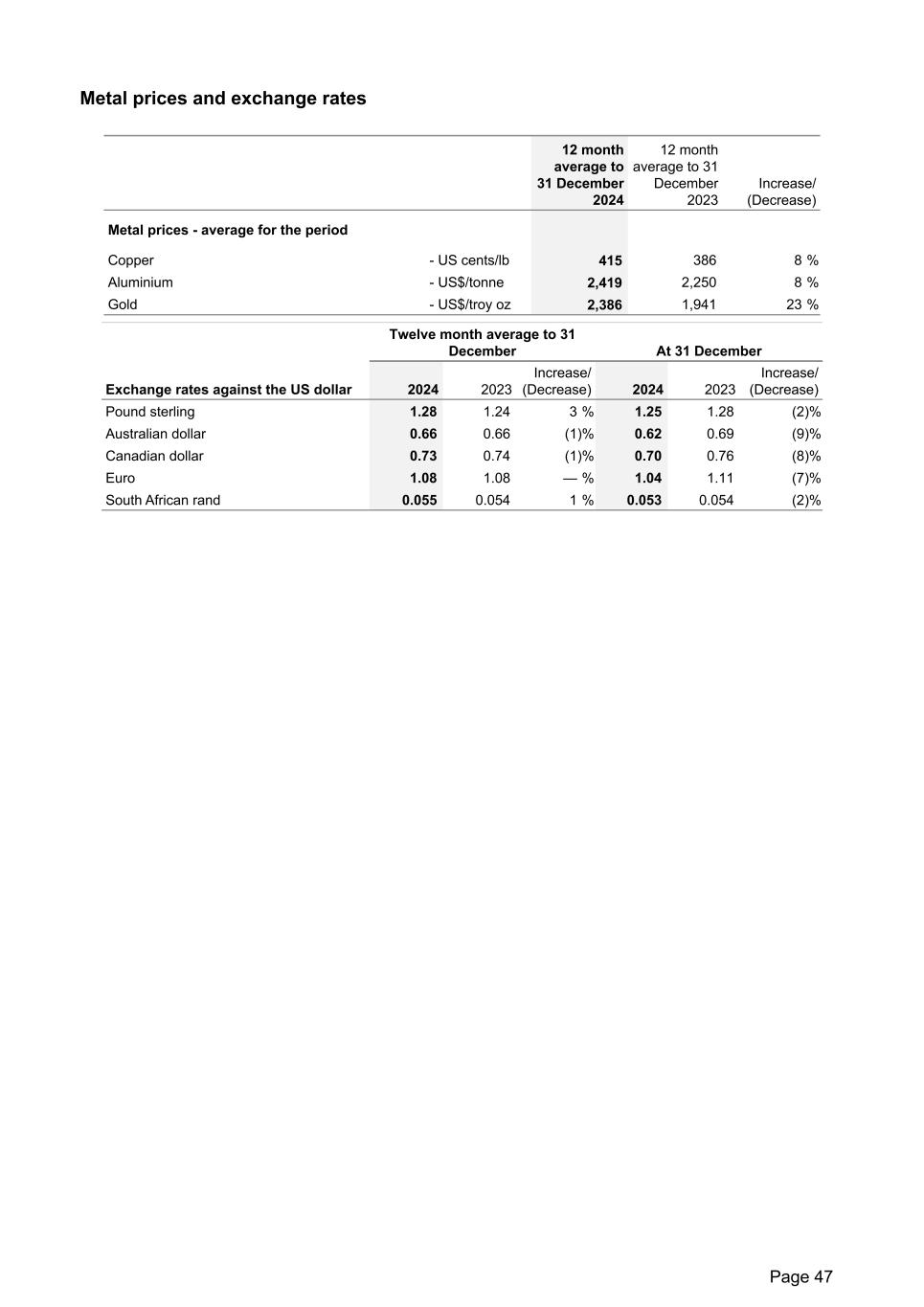 Metal prices and exchange rates 12 month average to 31 December 2024 12 month average to 31 December 2023 Increase/ (Decrease) Metal prices - average for the period Copper - US cents/lb 415 386 8 % Aluminium - US$/tonne 2,419 2,250 8 % Gold - US$/troy oz 2,386 1,941 23 % Twelve month average to 31 December At 31 December Exchange rates against the US dollar 2024 2023 Increase/ (Decrease) 2024 2023 Increase/ (Decrease) Pound sterling 1.28 1.24 3 % 1.25 1.28 (2) % Australian dollar 0.66 0.66 (1) % 0.62 0.69 (9) % Canadian dollar 0.73 0.74 (1) % 0.70 0.76 (8) % Euro 1.08 1.08 — % 1.04 1.11 (7) % South African rand 0.055 0.054 1 % 0.053 0.054 (2) % Page 47