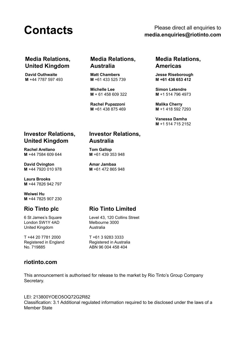Contacts Please direct all enquiries to media.enquiries@riotinto.com Media Relations, United Kingdom David Outhwaite M +44 7787 597 493 Media Relations, Australia Matt Chambers M +61 433 525 739 Michelle Lee M + 61 458 609 322 Rachel Pupazzoni M +61 438 875 469 Media Relations, Americas Jesse Riseborough M +61 436 653 412 Simon Letendre M +1 514 796 4973 Malika Cherry M +1 418 592 7293 Vanessa Damha M +1 514 715 2152 Investor Relations, United Kingdom Rachel Arellano M +44 7584 609 644 David Ovington M +44 7920 010 978 Laura Brooks M +44 7826 942 797 Weiwei Hu M +44 7825 907 230 Investor Relations, Australia Tom Gallop M +61 439 353 948 Amar Jambaa M +61 472 865 948 Rio Tinto plc 6 St James’s Square London SW1Y 4AD United Kingdom T +44 20 7781 2000 Registered in England No. 719885 Rio Tinto Limited Level 43, 120 Collins Street Melbourne 3000 Australia T +61 3 9283 3333 Registered in Australia ABN 96 004 458 404 riotinto.com This announcement is authorised for release to the market by Rio Tinto’s Group Company Secretary. LEI: 213800YOEO5OQ72G2R82 Classification: 3.1 Additional regulated information required to be disclosed under the laws of a Member State