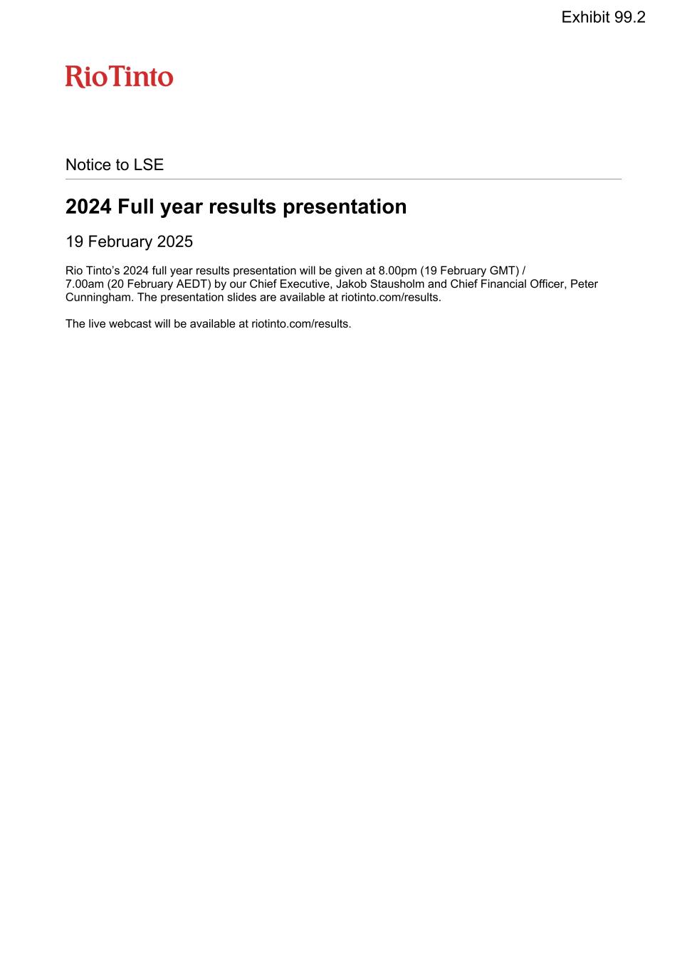 Notice to LSE 2024 Full year results presentation 19 February 2025 Rio Tinto’s 2024 full year results presentation will be given at 8.00pm (19 February GMT) / 7.00am (20 February AEDT) by our Chief Executive, Jakob Stausholm and Chief Financial Officer, Peter Cunningham. The presentation slides are available at riotinto.com/results. The live webcast will be available at riotinto.com/results. Exhibit 99.2