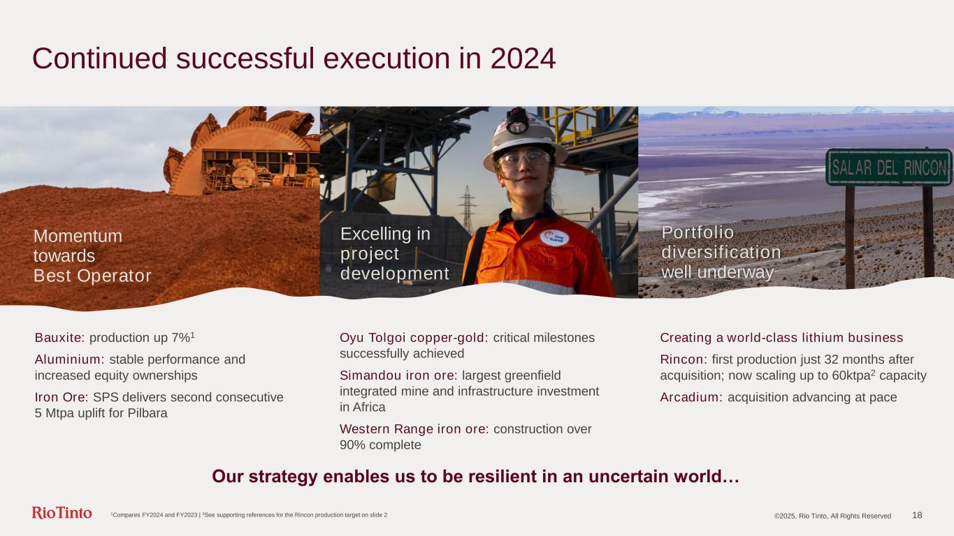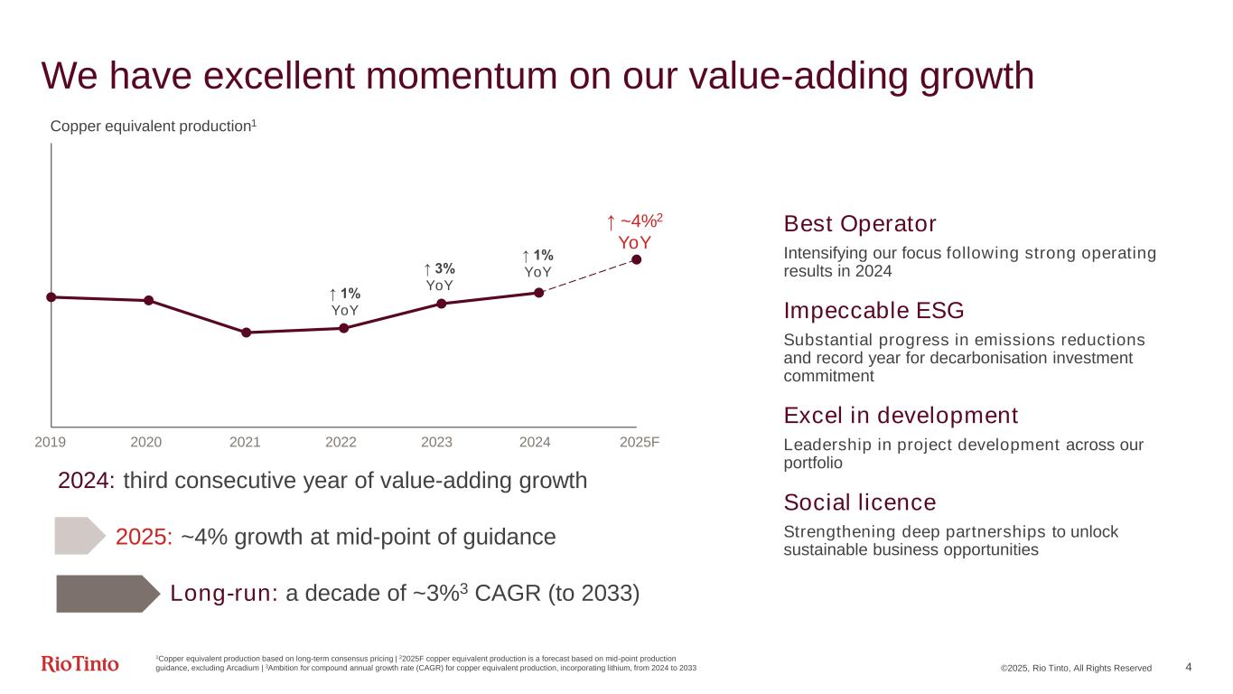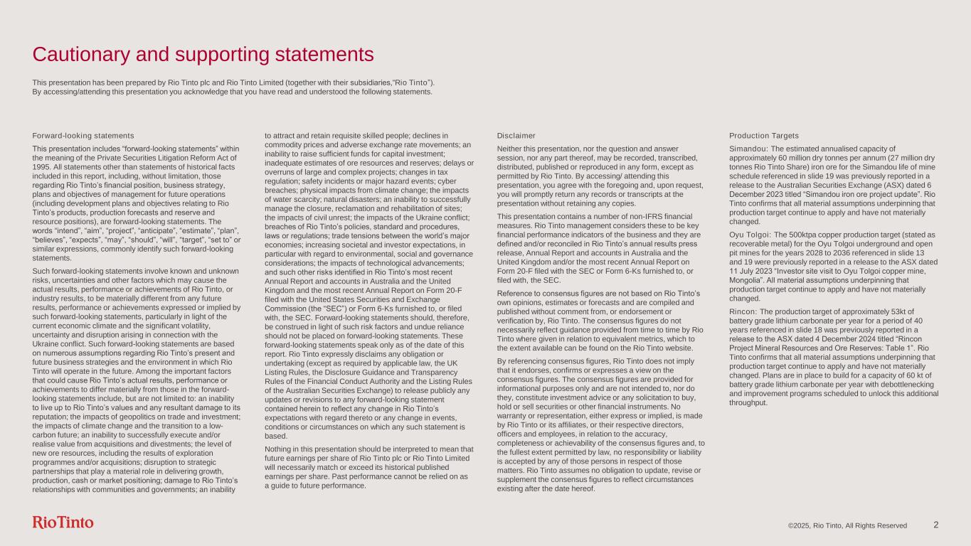 ©2025, Rio Tinto, All Rights Reserved 2 Cautionary and supporting statements This presentation has been prepared by Rio Tinto plc and Rio Tinto Limited (together with their subsidiaries,“Rio Tinto”). By accessing/attending this presentation you acknowledge that you have read and understood the following statements. Forward-looking statements This presentation includes “forward-looking statements” within the meaning of the Private Securities Litigation Reform Act of 1995. All statements other than statements of historical facts included in this report, including, without limitation, those regarding Rio Tinto’s financial position, business strategy, plans and objectives of management for future operations (including development plans and objectives relating to Rio Tinto’s products, production forecasts and reserve and resource positions), are forward-looking statements. The words “intend”, “aim”, “project”, “anticipate”, “estimate”, “plan”, “believes”, “expects”, “may”, “should”, “will”, “target”, “set to” or similar expressions, commonly identify such forward-looking statements. Such forward-looking statements involve known and unknown risks, uncertainties and other factors which may cause the actual results, performance or achievements of Rio Tinto, or industry results, to be materially different from any future results, performance or achievements expressed or implied by such forward-looking statements, particularly in light of the current economic climate and the significant volatility, uncertainty and disruption arising in connection with the Ukraine conflict. Such forward-looking statements are based on numerous assumptions regarding Rio Tinto’s present and future business strategies and the environment in which Rio Tinto will operate in the future. Among the important factors that could cause Rio Tinto’s actual results, performance or achievements to differ materially from those in the forward- looking statements include, but are not limited to: an inability to live up to Rio Tinto’s values and any resultant damage to its reputation; the impacts of geopolitics on trade and investment; the impacts of climate change and the transition to a low- carbon future; an inability to successfully execute and/or realise value from acquisitions and divestments; the level of new ore resources, including the results of exploration programmes and/or acquisitions; disruption to strategic partnerships that play a material role in delivering growth, production, cash or market positioning; damage to Rio Tinto’s relationships with communities and governments; an inability to attract and retain requisite skilled people; declines in commodity prices and adverse exchange rate movements; an inability to raise sufficient funds for capital investment; inadequate estimates of ore resources and reserves; delays or overruns of large and complex projects; changes in tax regulation; safety incidents or major hazard events; cyber breaches; physical impacts from climate change; the impacts of water scarcity; natural disasters; an inability to successfully manage the closure, reclamation and rehabilitation of sites; the impacts of civil unrest; the impacts of the Ukraine conflict; breaches of Rio Tinto’s policies, standard and procedures, laws or regulations; trade tensions between the world’s major economies; increasing societal and investor expectations, in particular with regard to environmental, social and governance considerations; the impacts of technological advancements; and such other risks identified in Rio Tinto’s most recent Annual Report and accounts in Australia and the United Kingdom and the most recent Annual Report on Form 20-F filed with the United States Securities and Exchange Commission (the “SEC”) or Form 6-Ks furnished to, or filed with, the SEC. Forward-looking statements should, therefore, be construed in light of such risk factors and undue reliance should not be placed on forward-looking statements. These forward-looking statements speak only as of the date of this report. Rio Tinto expressly disclaims any obligation or undertaking (except as required by applicable law, the UK Listing Rules, the Disclosure Guidance and Transparency Rules of the Financial Conduct Authority and the Listing Rules of the Australian Securities Exchange) to release publicly any updates or revisions to any forward-looking statement contained herein to reflect any change in Rio Tinto’s expectations with regard thereto or any change in events, conditions or circumstances on which any such statement is based. Nothing in this presentation should be interpreted to mean that future earnings per share of Rio Tinto plc or Rio Tinto Limited will necessarily match or exceed its historical published earnings per share. Past performance cannot be relied on as a guide to future performance. Disclaimer Neither this presentation, nor the question and answer session, nor any part thereof, may be recorded, transcribed, distributed, published or reproduced in any form, except as permitted by Rio Tinto. By accessing/ attending this presentation, you agree with the foregoing and, upon request, you will promptly return any records or transcripts at the presentation without retaining any copies. This presentation contains a number of non-IFRS financial measures. Rio Tinto management considers these to be key financial performance indicators of the business and they are defined and/or reconciled in Rio Tinto’s annual results press release, Annual Report and accounts in Australia and the United Kingdom and/or the most recent Annual Report on Form 20-F filed with the SEC or Form 6-Ks furnished to, or filed with, the SEC. Reference to consensus figures are not based on Rio Tinto’s own opinions, estimates or forecasts and are compiled and published without comment from, or endorsement or verification by, Rio Tinto. The consensus figures do not necessari