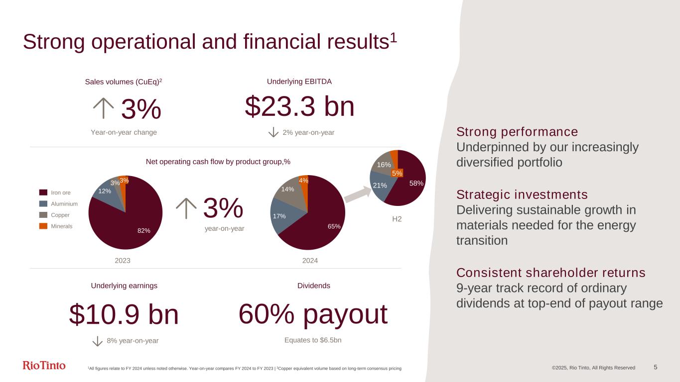 We have excellent momentum on our value-adding growth Simandou rail loop, Guinea 2019 2020 2021 2022 2023 2024 2025F ↑ 1% YoY ↑ 3% YoY ↑ 1% YoY ↑ ~4%2 YoY 2024: third consecutive year of value-adding growth ©2025, Rio Tinto, All Rights Reserved 1Copper equivalent production based on long-term consensus pricing | 22025F copper equivalent production is a forecast based on mid-point production guidance, excluding Arcadium | 3Ambition for compound annual growth rate (CAGR) for copper equivalent production, incorporating lithium, from 2024 to 2033 Long-run: a decade of ~3%3 CAGR (to 2033) 2025: ~4% growth at mid-point of guidance 4 Copper equivalent production1 Best Operator Intensifying our focus following strong operating results in 2024 Impeccable ESG Substantial progress in emissions reductions and record year for decarbonisation investment commitment Excel in development Leadership in project development across our portfolio Social licence Strengthening deep partnerships to unlock sustainable business opportunities