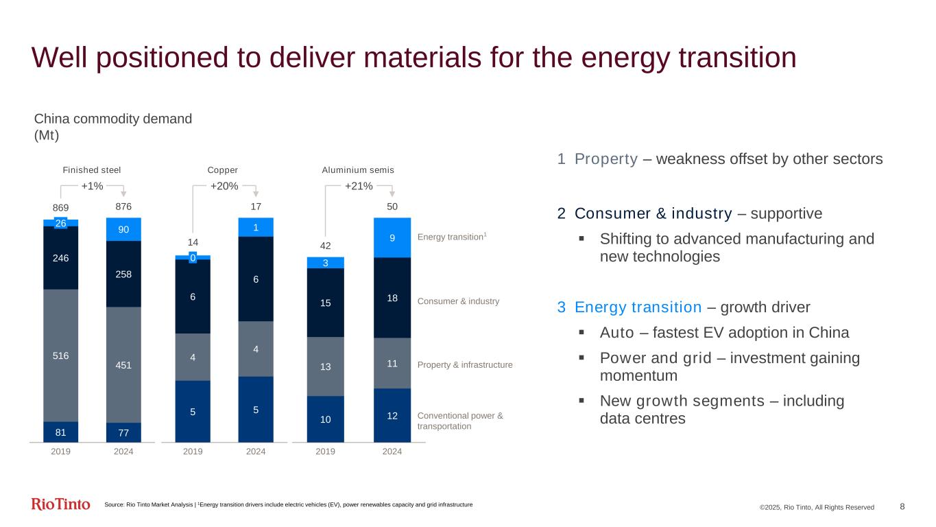 ©2025, Rio Tinto, All Rights Reserved 7 Strong financial performance $bn, except where stated 2024 2023 Comparison Consolidated sales revenue 53.7 54.0 -1% Underlying EBITDA 23.3 23.9 -2% Underlying ROCE 18% 20% -2pp Cash flow from operations 15.6 15.2 +3% Share of capital investment1 9.5 7.0 +37% Dividend payout ratio 60% 60% Net debt 5.5 4.2 +30% 1 Represents purchases of property, plant and equipment and intangible assets (of $9.6 billion) and funding provided by the group to equity accounted units for its share of investment (of $1.0 billion), net of equity/shareholder loan financing received/due from non-controlling interests (of $1.1 billion) | 2 Yearly average Platts 62% Fe, FOB China $/dmt Resilient financials Despite 11% decrease in iron ore price2 Strong cash generation Supported by effective working capital management Disciplined capital investments Driving growth and diversification Strong balance sheet Consistent shareholder returns