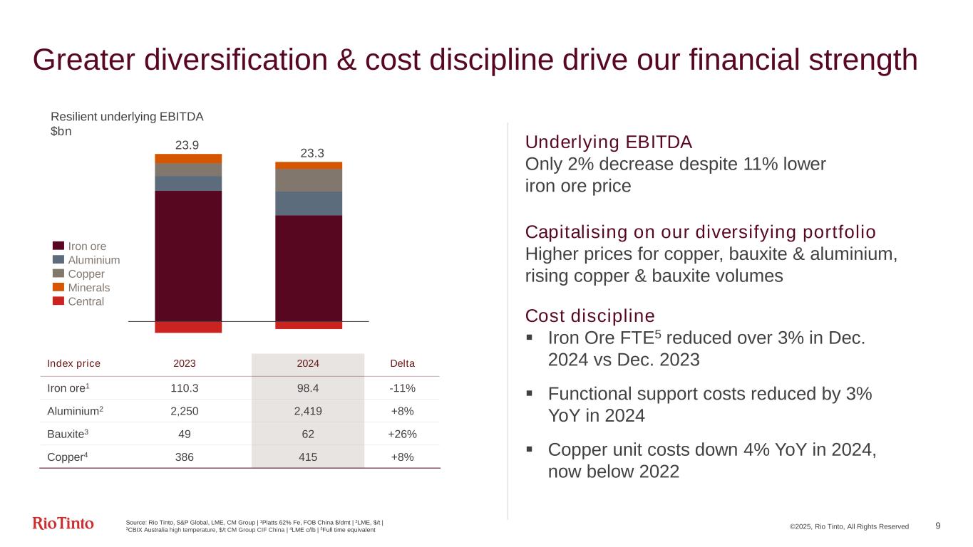 8 Well positioned to deliver materials for the energy transition 5 5 4 4 6 6 1 0 2019 2024 14 17 +20% 10 12 13 11 15 18 3 9 2019 2024 42 50 +21% 81 77 516 451 246 258 90 26 2019 2024 869 876 +1% Aluminium semisFinished steel Copper China commodity demand (Mt) Source: Rio Tinto Market Analysis | 1Energy transition drivers include electric vehicles (EV), power renewables capacity and grid infrastructure 1 Property – weakness offset by other sectors 2 Consumer & industry – supportive ▪ Shifting to advanced manufacturing and new technologies 3 Energy transition – growth driver ▪ Auto – fastest EV adoption in China ▪ Power and grid – investment gaining momentum ▪ New growth segments – including data centres Energy transition1 ©2025, Rio Tinto, All Rights Reserved Property & infrastructure Consumer & industry Conventional power & transportation