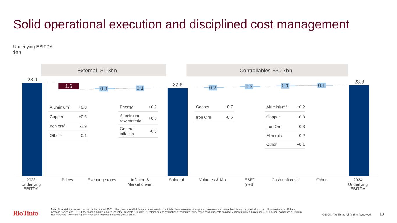 ©2025, Rio Tinto, All Rights Reserved 9 Greater diversification & cost discipline drive our financial strength Source: Rio Tinto, S&P Global, LME, CM Group | 1Platts 62% Fe, FOB China $/dmt | 2LME, $/t | 3CBIX Australia high temperature, $/t CM Group CIF China | 4LME c/lb | 5Full time equivalent 23.9 23.3 Underlying EBITDA Only 2% decrease despite 11% lower iron ore price Capitalising on our diversifying portfolio Higher prices for copper, bauxite & aluminium, rising copper & bauxite volumes Cost discipline ▪ Iron Ore FTE5 reduced over 3% in Dec. 2024 vs Dec. 2023 ▪ Functional support costs reduced by 3% YoY in 2024 ▪ Copper unit costs down 4% YoY in 2024, now below 2022 Resilient underlying EBITDA $bn Index price 2023 2024 Delta Iron ore1 110.3 98.4 -11% Aluminium2 2,250 2,419 +8% Bauxite3 49 62 +26% Copper4 386 415 +8% Iron ore Aluminium Copper Minerals Central