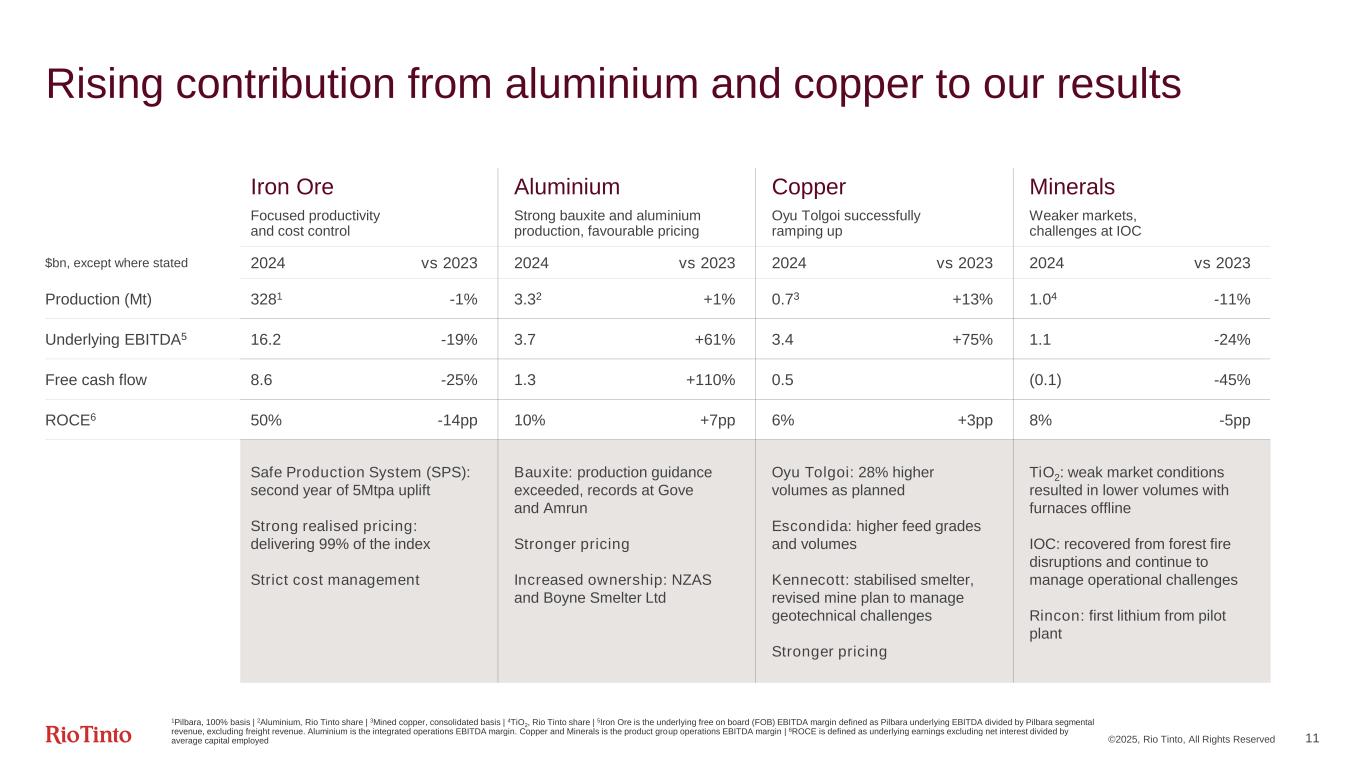 ©2025, Rio Tinto, All Rights Reserved 10 Solid operational execution and disciplined cost management 23.9 22.6 23.3 1.6 2023 Underlying EBITDA Prices 0.3 Exchange rates 0.1 Inflation & Market driven Subtotal 0.2 Volumes & Mix 0.3 E&E (net) 0.1 Cash unit cost5 0.1 Other 2024 Underlying EBITDA External -$1.3bn Controllables +$0.7bn Aluminium1 +0.8 Copper +0.6 Iron ore2 -2.9 Other3 -0.1 Energy +0.2 Aluminium raw material +0.5 General inflation -0.5 Aluminium1 +0.2 Copper +0.3 Iron Ore -0.3 Minerals -0.2 Other +0.1 Note: Financial figures are rounded to the nearest $100 million, hence small differences may result in the totals | 1Aluminium includes primary aluminium, alumina, bauxite and recycled aluminium | 2Iron ore includes Pilbara, portside trading and IOC | 3Other prices mainly relate to industrial minerals (-$0.2bn) | 4Exploration and evaluation expenditure | 5Operating cash unit costs on page 5 of 2024 full results release (+$0.6 billion) comprises aluminium raw materials (+$0.5 billion) and other cash unit cost increases (+$0.1 billion) 4 Underlying EBITDA $bn Copper +0.7 Iron Ore -0.5