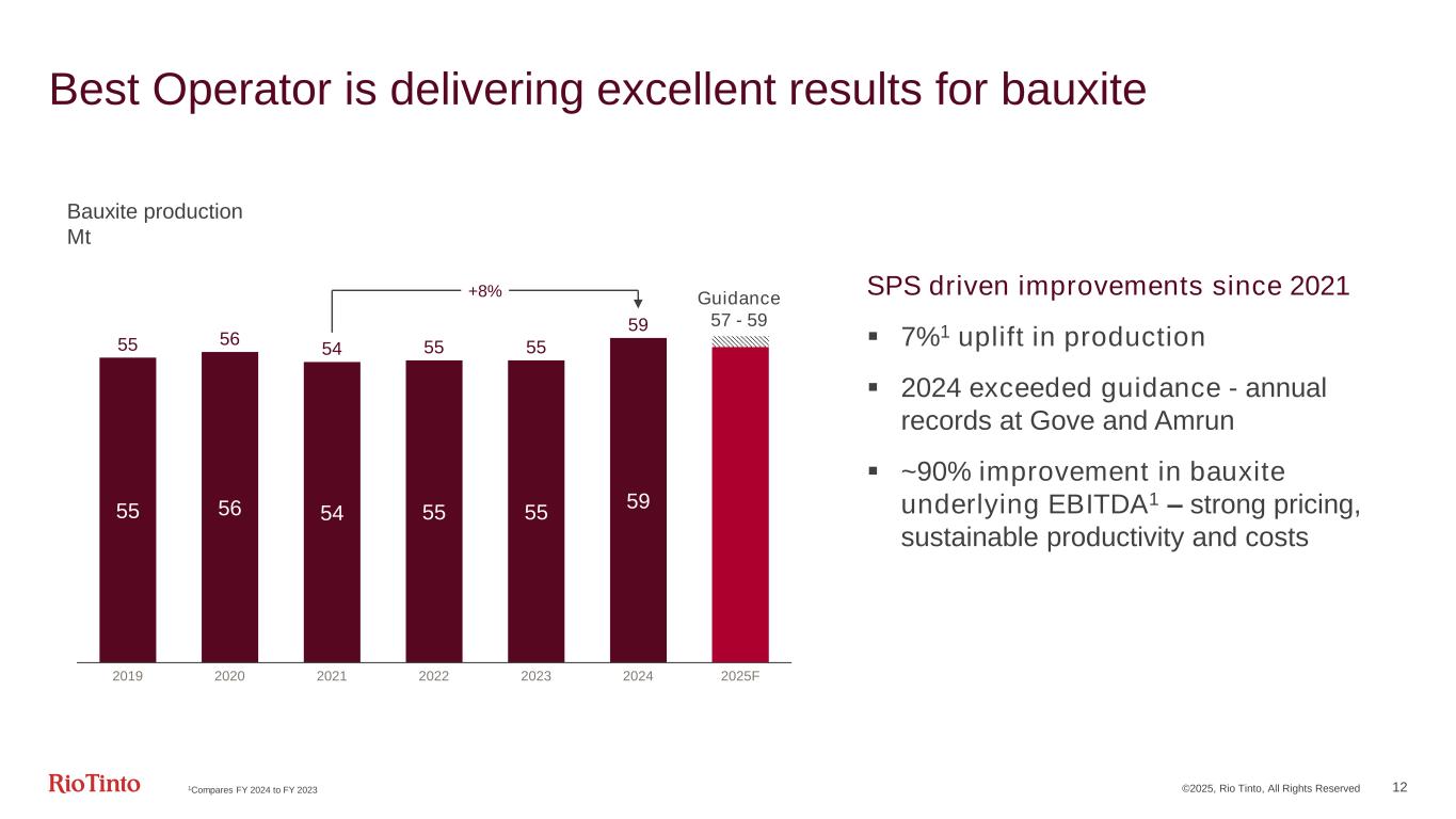 ©2025, Rio Tinto, All Rights Reserved 11 Rising contribution from aluminium and copper to our results Iron Ore Aluminium Copper Minerals Focused productivity and cost control Strong bauxite and aluminium production, favourable pricing Oyu Tolgoi successfully ramping up Weaker markets, challenges at IOC $bn, except where stated 2024 vs 2023 2024 vs 2023 2024 vs 2023 2024 vs 2023 Production (Mt) 3281 -1% 3.32 +1% 0.73 +13% 1.04 -11% Underlying EBITDA5 16.2 -19% 3.7 +61% 3.4 +75% 1.1 -24% Free cash flow 8.6 -25% 1.3 +110% 0.5 (0.1) -45% ROCE6 50% -14pp 10% +7pp 6% +3pp 8% -5pp Safe Production System (SPS): second year of 5Mtpa uplift Strong realised pricing: delivering 99% of the index Strict cost management Bauxite: production guidance exceeded, records at Gove and Amrun Stronger pricing Increased ownership: NZAS and Boyne Smelter Ltd Oyu Tolgoi: 28% higher volumes as planned Escondida: higher feed grades and volumes Kennecott: stabilised smelter, revised mine plan to manage geotechnical challenges Stronger pricing TiO2: weak market conditions resulted in lower volumes with furnaces offline IOC: recovered from forest fire disruptions and continue to manage operational challenges Rincon: first lithium from pilot plant 1Pilbara, 100% basis | 2Aluminium, Rio Tinto share | 3Mined copper, consolidated basis | 4TiO2, Rio Tinto share | 5Iron Ore is the underlying free on board (FOB) EBITDA margin defined as Pilbara underlying EBITDA divided by Pilbara segmental revenue, excluding freight revenue. Aluminium is the integrated operations EBITDA margin. Copper and Minerals is the product group operations EBITDA margin | 6ROCE is defined as underlying earnings excluding net interest divided by average capital employed