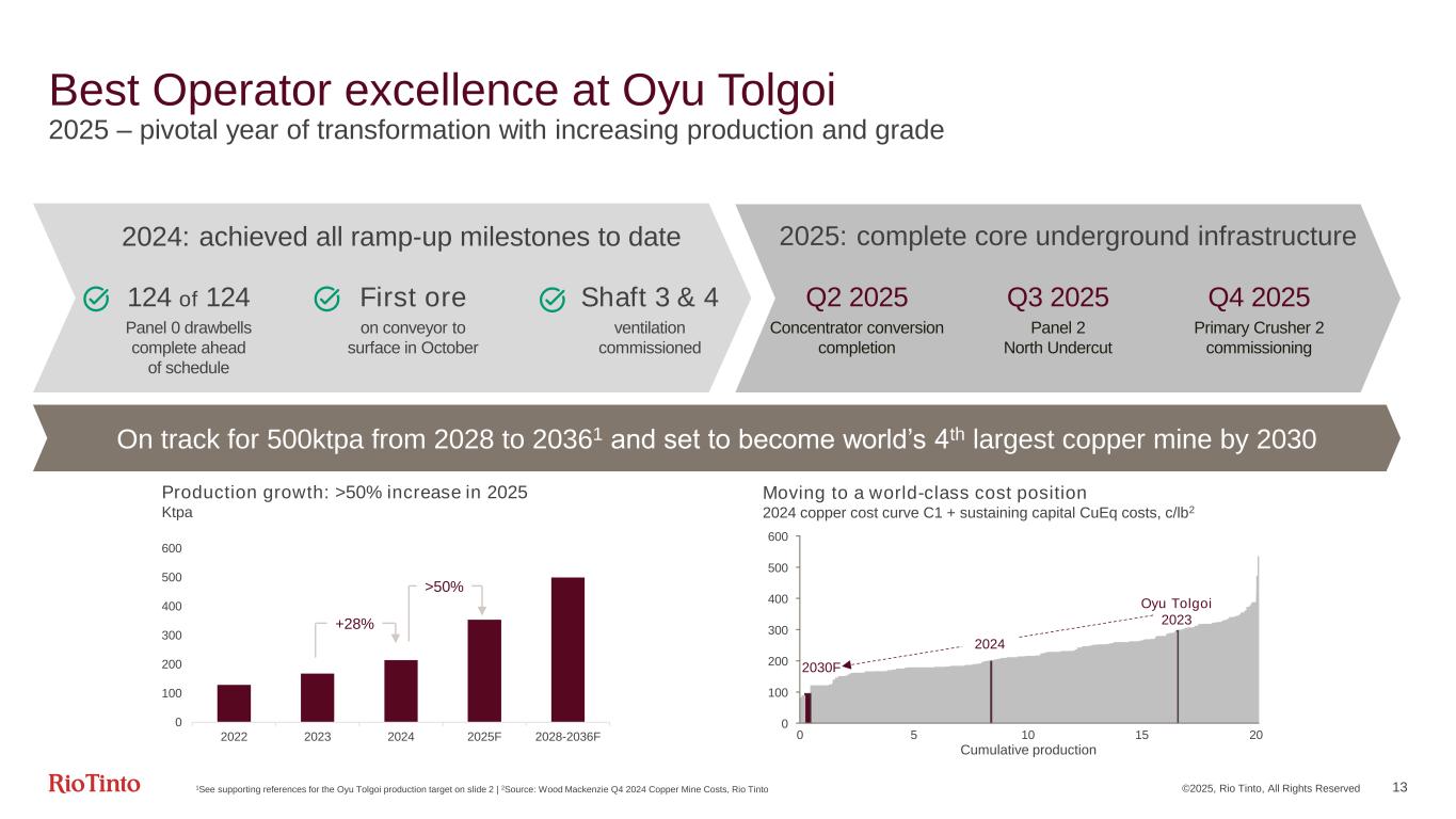 ©2025, Rio Tinto, All Rights Reserved 12 Best Operator is delivering excellent results for bauxite 55 2019 56 2020 54 2021 55 2022 55 2023 59 2024 2025F 55 56 54 55 55 59 +8% Guidance 57 - 59 SPS driven improvements since 2021 ▪ 7%1 uplift in production ▪ 2024 exceeded guidance - annual records at Gove and Amrun ▪ ~90% improvement in bauxite underlying EBITDA1 – strong pricing, sustainable productivity and costs 1Compares FY 2024 to FY 2023 Bauxite production Mt