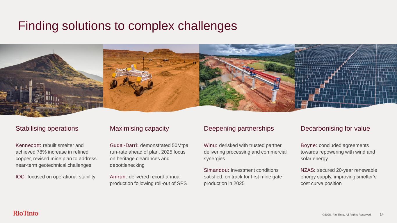 13 Best Operator excellence at Oyu Tolgoi 2025 – pivotal year of transformation with increasing production and grade 124 of 124 Panel 0 drawbells complete ahead of schedule First ore on conveyor to surface in October Q4 2025 Primary Crusher 2 commissioning Q2 2025 Concentrator conversion completion Moving to a world-class cost position 2024 copper cost curve C1 + sustaining capital CuEq costs, c/lb2 1See supporting references for the Oyu Tolgoi production target on slide 2 | 2Source: Wood Mackenzie Q4 2024 Copper Mine Costs, Rio Tinto Shaft 3 & 4 ventilation commissioned Q3 2025 Panel 2 North Undercut ©2025, Rio Tinto, All Rights Reserved Cumulative production 600 500 300 200 100 0 20151050 400 Oyu Tolgoi 2023 2024 2030F Production growth: >50% increase in 2025 Ktpa On track for 500ktpa from 2028 to 20361 and set to become world’s 4th largest copper mine by 2030 2024: achieved all ramp-up milestones to date 2025: complete core underground infrastructure 0 100 200 300 400 500 600 2022 2023 2024 2025F 2028-2036F +28% >50%