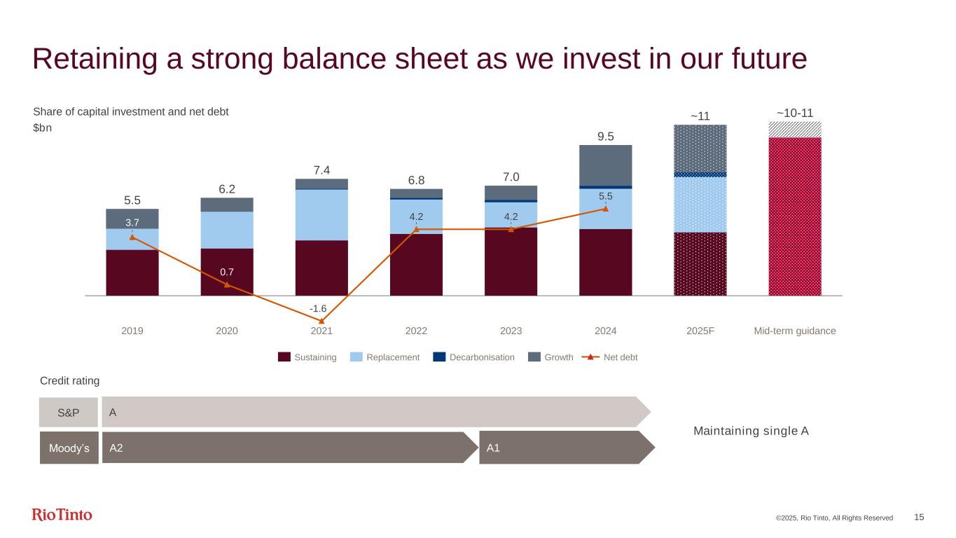 14 Finding solutions to complex challenges ©2025, Rio Tinto, All Rights Reserved Stabilising operations Kennecott: rebuilt smelter and achieved 78% increase in refined copper, revised mine plan to address near-term geotechnical challenges IOC: focused on operational stability Maximising capacity Gudai-Darri: demonstrated 50Mtpa run-rate ahead of plan, 2025 focus on heritage clearances and debottlenecking Amrun: delivered record annual production following roll-out of SPS Deepening partnerships Winu: derisked with trusted partner delivering processing and commercial synergies Simandou: investment conditions satisfied, on track for first mine gate production in 2025 Decarbonising for value Boyne: concluded agreements towards repowering with wind and solar energy NZAS: secured 20-year renewable energy supply, improving smelter’s cost curve position
