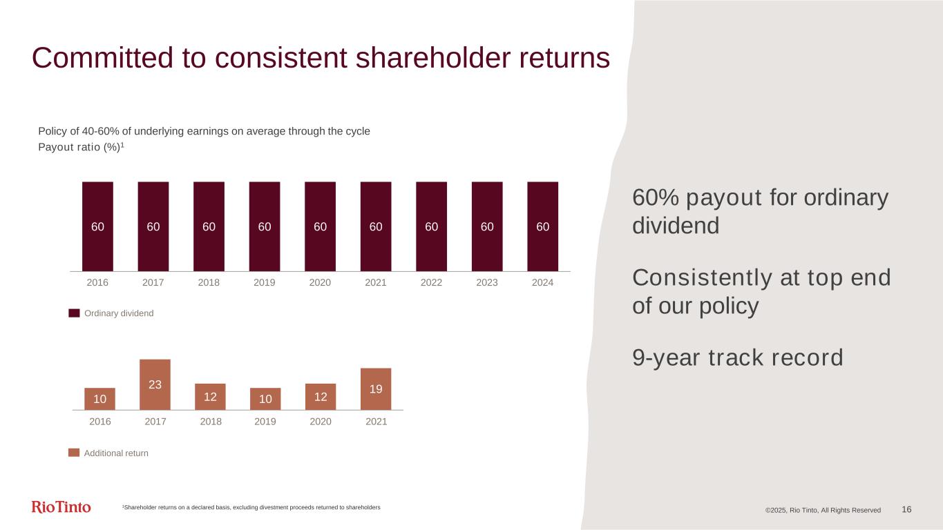 Retaining a strong balance sheet as we invest in our future S&P Moody’s A A2 A1 Credit rating ©2025, Rio Tinto, All Rights Reserved 15 0.7 4.2 4.2 5.5 3.7 2019 2020 -1.6 2021 2022 2023 2024 2025F Mid-term guidance 5.5 6.2 7.4 6.8 7.0 9.5 ~11 ~10-11 Sustaining Replacement Decarbonisation Growth Net debt Share of capital investment and net debt $bn Maintaining single A