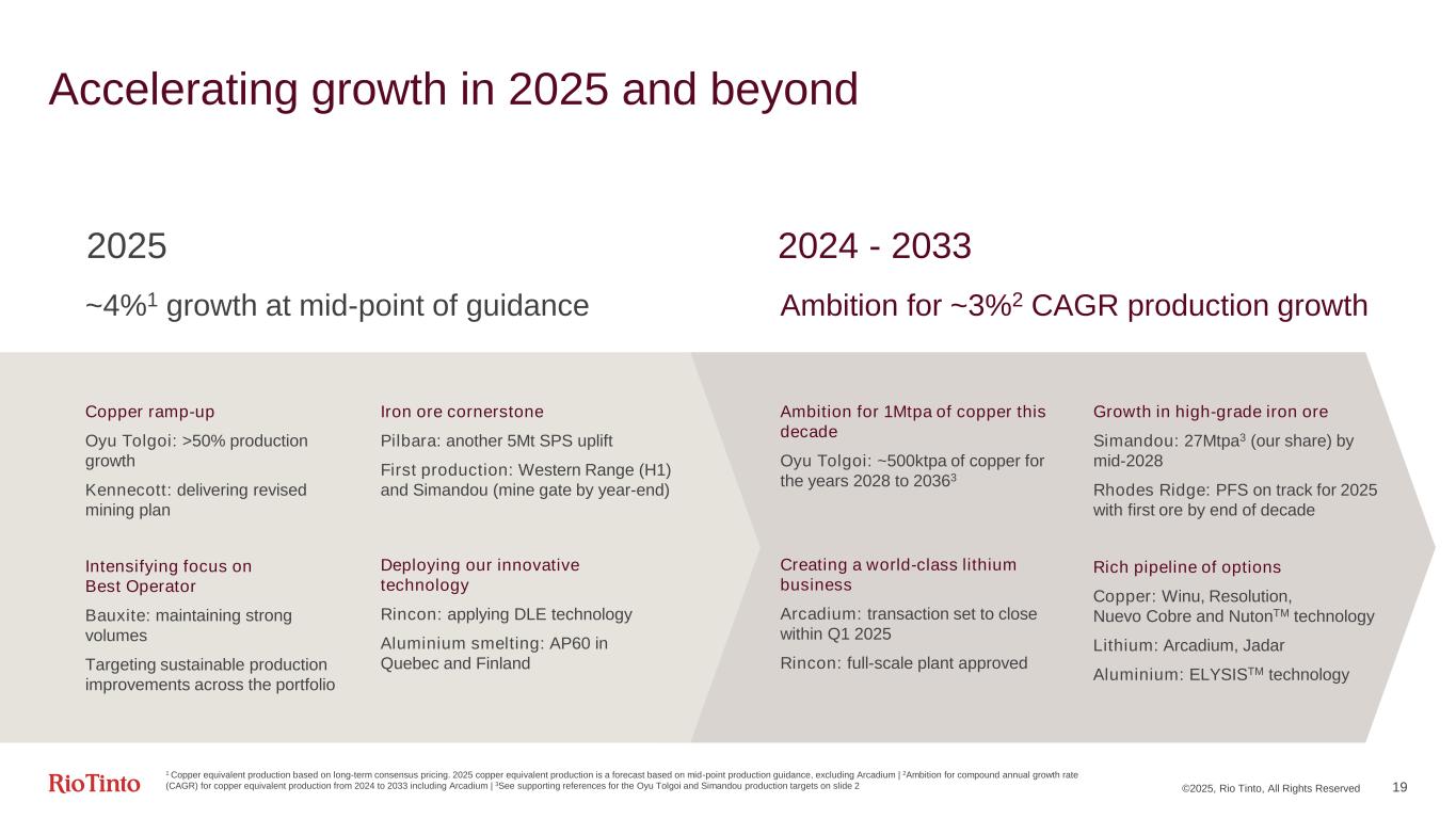 Continued successful execution in 2024 1Compares FY2024 and FY2023 | 2See supporting references for the Rincon production target on slide 2 Creating a world-class lithium business Rincon: first production just 32 months after acquisition; now scaling up to 60ktpa2 capacity Arcadium: acquisition advancing at pace Bauxite: production up 7%1 Aluminium: stable performance and increased equity ownerships Iron Ore: SPS delivers second consecutive 5 Mtpa uplift for Pilbara Oyu Tolgoi copper-gold: critical milestones successfully achieved Simandou iron ore: largest greenfield integrated mine and infrastructure investment in Africa Western Range iron ore: construction over 90% complete Momentum towards Best Operator Excelling in project development Portfolio diversification well underway Our strategy enables us to be resilient in an uncertain world… ©2025, Rio Tinto, All Rights Reserved 18