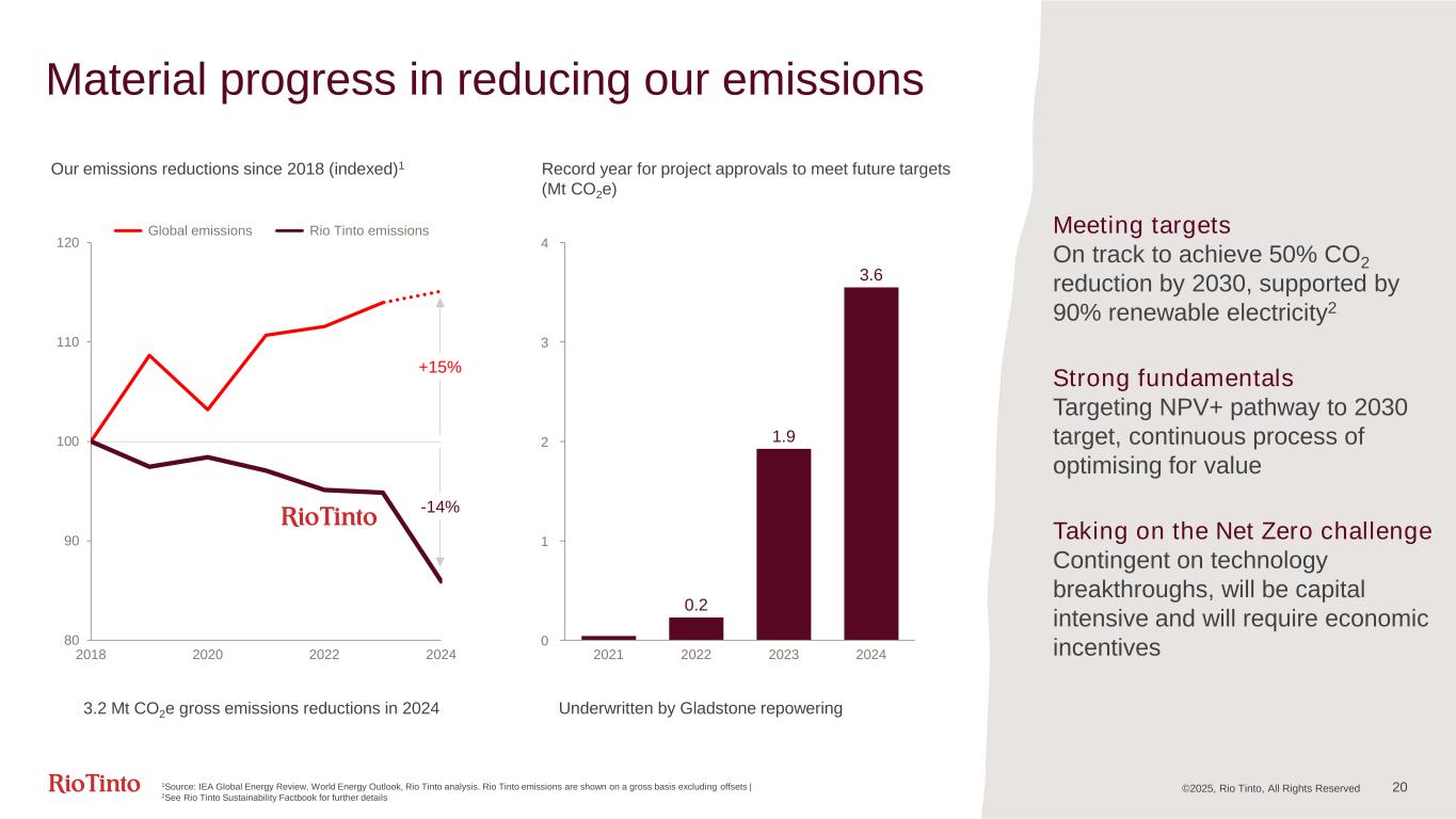 Material progress in reducing our emissions 80 90 100 110 120 2018 2020 2022 2024 0 1 2 3 4 2021 2022 2023 2024 0.2 1.9 3.6 Record year for project approvals to meet future targets (Mt CO2e) Our emissions reductions since 2018 (indexed)1 Meeting targets On track to achieve 50% CO2 reduction by 2030, supported by 90% renewable electricity2 Strong fundamentals Targeting NPV+ pathway to 2030 target, continuous process of optimising for value Taking on the Net Zero challenge Contingent on technology breakthroughs, will be capital intensive and will require economic incentives 1Source: IEA Global Energy Review, World Energy Outlook, Rio Tinto analysis. Rio Tinto emissions are shown on a gross basis excluding offsets | 2See Rio Tinto Sustainability Factbook for further details 3.2 Mt CO2e gross emissions reductions in 2024 Underwritten by Gladstone repowering -14% +15% ©2025, Rio Tinto, All Rights Reserved Global emissions Rio Tinto emissions 20