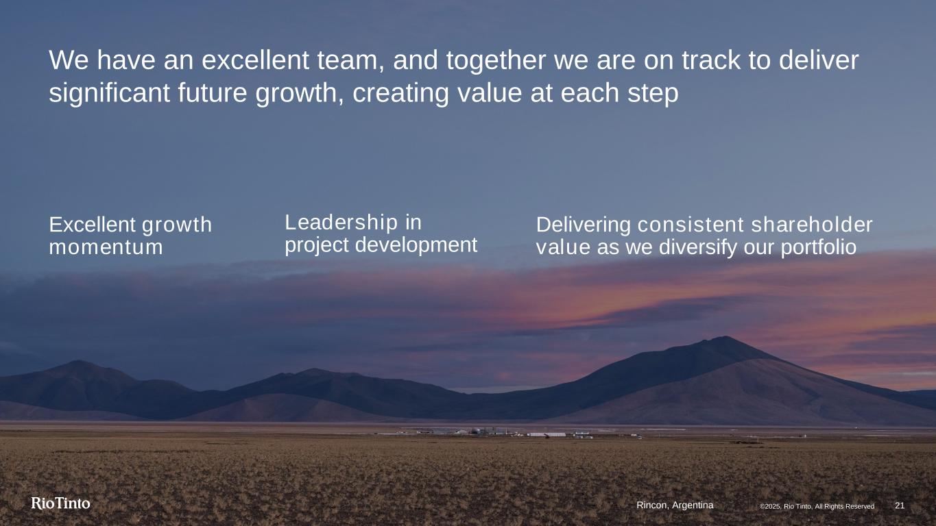Excellent growth momentum Leadership in project development Delivering consistent shareholder value as we diversify our portfolio We have an excellent team, and together we are on track to deliver significant future growth, creating value at each step 21©2025, Rio Tinto, All Rights ReservedRincon, Argentina