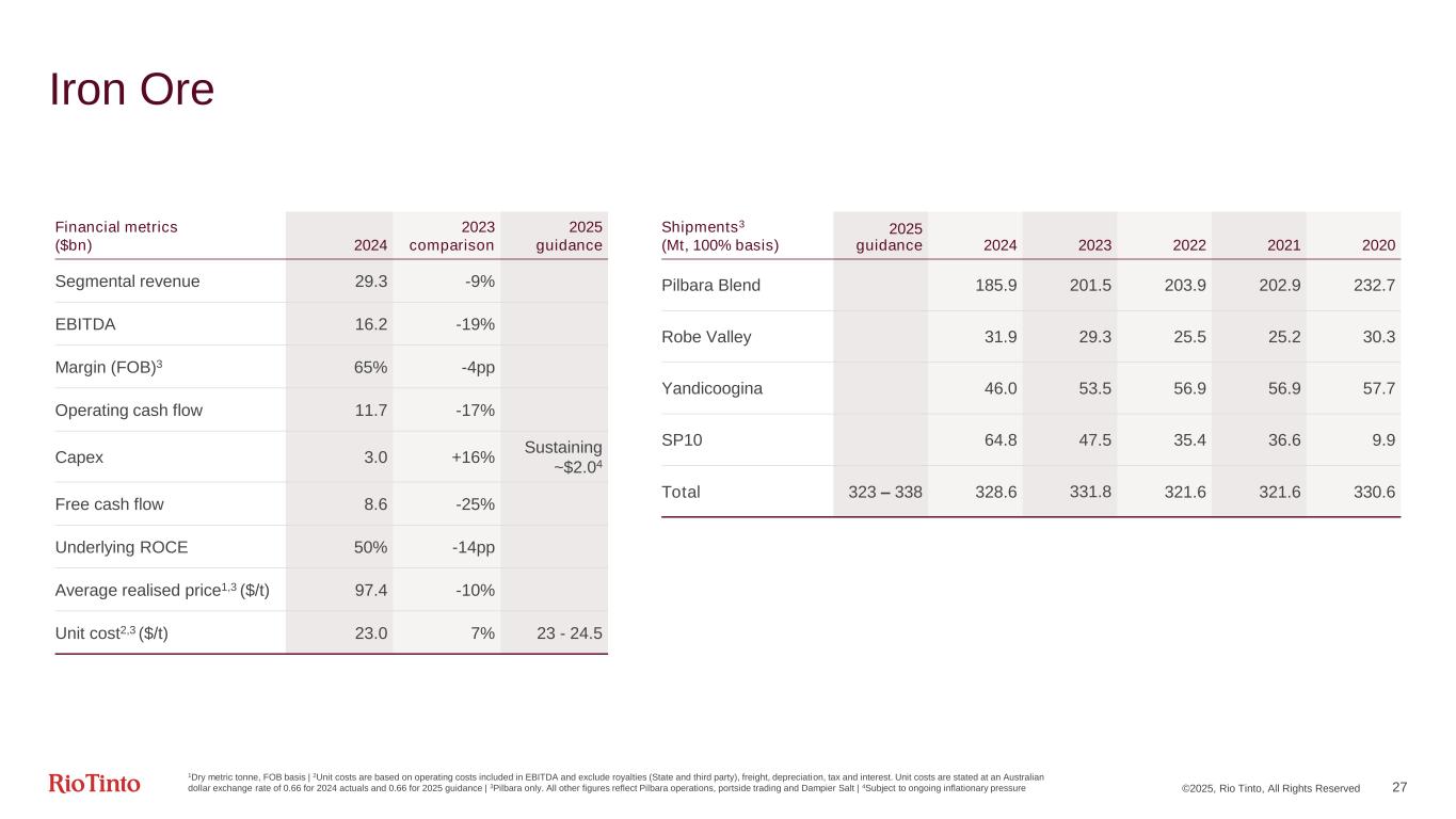 ©2025, Rio Tinto, All Rights Reserved 26 Simplified earnings by Business Unit for 2024 Atlantic Aluminium Pacific Aluminium Copper Pilbara Sales volume 2,240kt 1,049kt 756kt5 284.6Mt8 Average benchmark price $2,419/t $2,419/t 415c/lb6 $98.4/dmt9 Premiums, provisional pricing, by-product sales, product mix, other $483/t2 $273/t2 77c/lb $(1)/dmt Revenue per unit $2,901/t3 $2,692/t3 492c/lb $97.4/dmt Unit cost1 $1,734/t4 $2,150/t4 212c/lb7 $23.0/t Other costs per unit $446/t $196/t 37c/lb $16.3/t10 Margin per unit $722/t $346/t 243c/lb $58.1/t Total underlying EBITDA ($m) 1,63911 363 4,046 16,543 1Calculated using production volumes | 2Includes Midwest premium duty paid, which was 59% of our volumes in 2024 and value added premiums which were 46% of the primary metal we sold | 3Segmental revenue per Financial Information by Business Unit includes other revenue not included in the realised price | 4Includes costs before casting | 5Sales volume comprises Oyu Tolgoi payable copper in concentrates collected by customers from the Mongolia/China border; Escondida payable copper in concentrates and refined copper, and Kennecott refined copper | 6Average LME | 7C1 copper unit costs on a gross basis (excluding by-product credits) | 8Consolidated basis | 9Platts (FOB) index for 62% iron fines | 10Includes freight and royalties | 11Includes EBITDA from Matalco