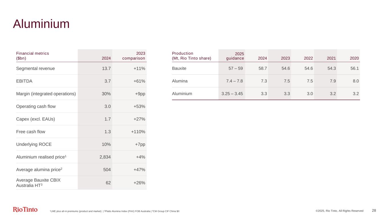 ©2025, Rio Tinto, All Rights Reserved 27 Iron Ore Financial metrics ($bn) 2024 2023 comparison 2025 guidance Segmental revenue 29.3 -9% EBITDA 16.2 -19% Margin (FOB)3 65% -4pp Operating cash flow 11.7 -17% Capex 3.0 +16% Sustaining ~$2.04 Free cash flow 8.6 -25% Underlying ROCE 50% -14pp Average realised price1,3 ($/t) 97.4 -10% Unit cost2,3 ($/t) 23.0 7% 23 - 24.5 Shipments3 (Mt, 100% basis) 2025 guidance 2024 2023 2022 2021 2020 Pilbara Blend 185.9 201.5 203.9 202.9 232.7 Robe Valley 31.9 29.3 25.5 25.2 30.3 Yandicoogina 46.0 53.5 56.9 56.9 57.7 SP10 64.8 47.5 35.4 36.6 9.9 Total 323 – 338 328.6 331.8 321.6 321.6 330.6 1Dry metric tonne, FOB basis | 2Unit costs are based on operating costs included in EBITDA and exclude royalties (State and third party), freight, depreciation, tax and interest. Unit costs are stated at an Australian dollar exchange rate of 0.66 for 2024 actuals and 0.66 for 2025 guidance | 3Pilbara only. All other figures reflect Pilbara operations, portside trading and Dampier Salt | 4Subject to ongoing inflationary pressure