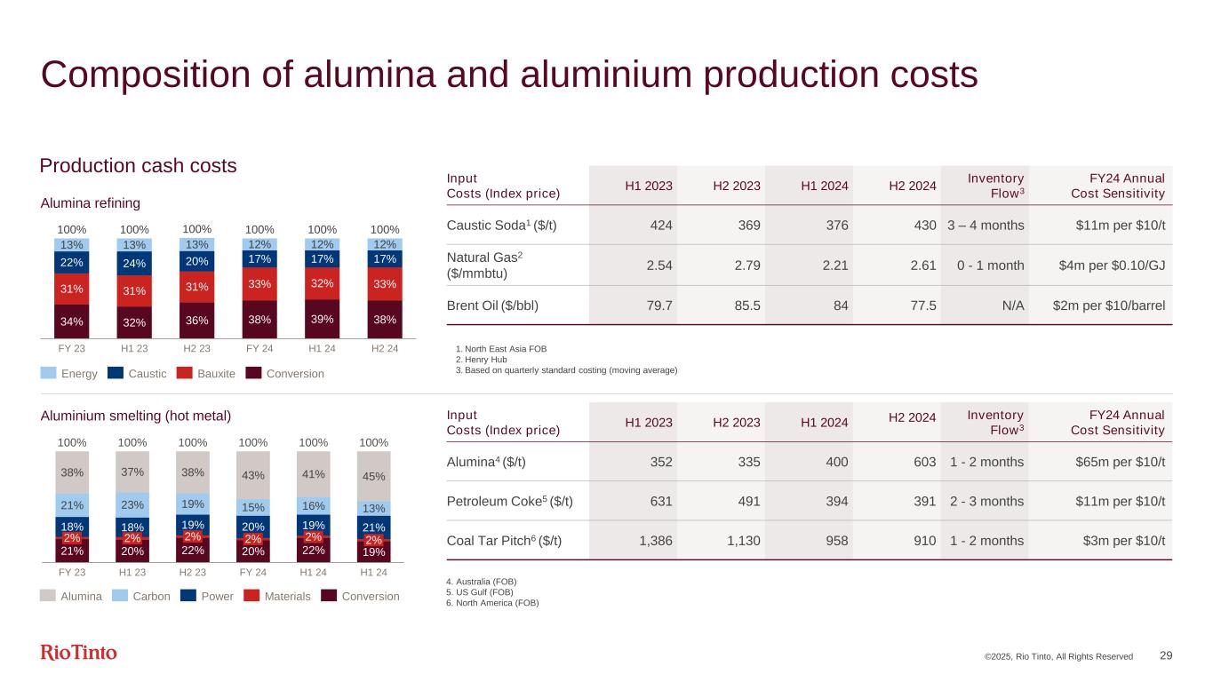 ©2025, Rio Tinto, All Rights Reserved 28 Aluminium Production (Mt, Rio Tinto share) 2025 guidance 2024 2023 2022 2021 2020 Bauxite 57 – 59 58.7 54.6 54.6 54.3 56.1 Alumina 7.4 – 7.8 7.3 7.5 7.5 7.9 8.0 Aluminium 3.25 – 3.45 3.3 3.3 3.0 3.2 3.2 1LME plus all-in premiums (product and market) | 2Platts Alumina Index (PAX) FOB Australia | 3CM Group CIF China $/t Financial metrics ($bn) 2024 2023 comparison Segmental revenue 13.7 +11% EBITDA 3.7 +61% Margin (integrated operations) 30% +9pp Operating cash flow 3.0 +53% Capex (excl. EAUs) 1.7 +27% Free cash flow 1.3 +110% Underlying ROCE 10% +7pp Aluminium realised price1 2,834 +4% Average alumina price2 504 +47% Average Bauxite CBIX Australia HT3 62 +26%