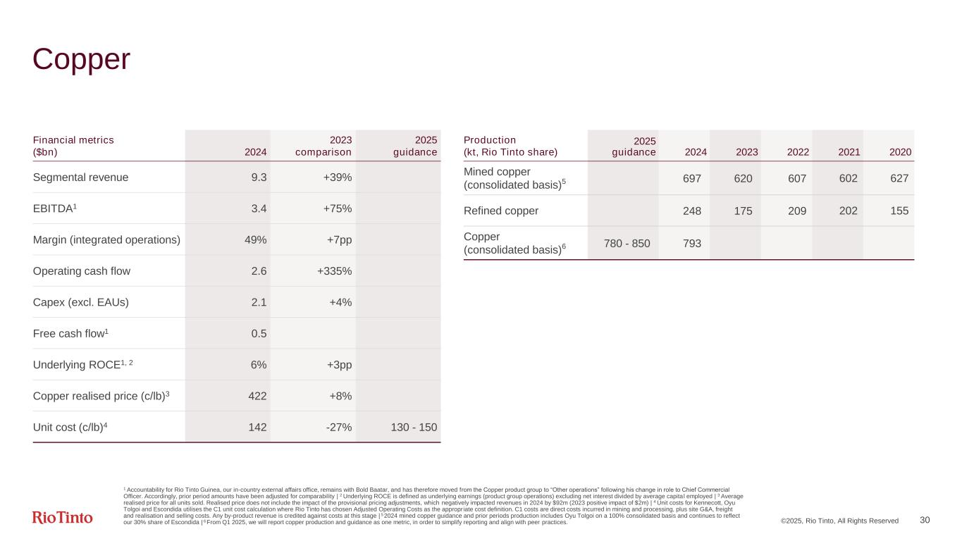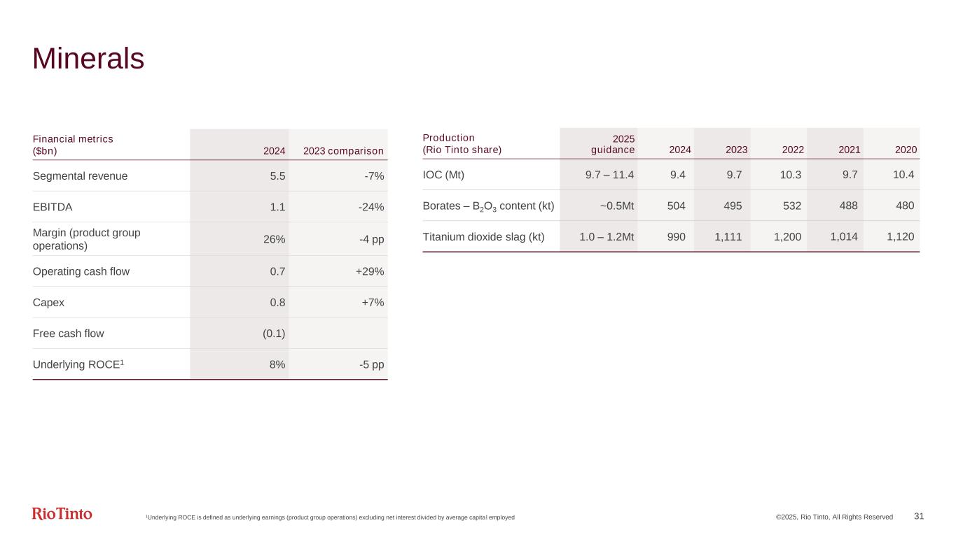 ©2025, Rio Tinto, All Rights Reserved 30 Copper 1 Accountability for Rio Tinto Guinea, our in-country external affairs office, remains with Bold Baatar, and has therefore moved from the Copper product group to “Other operations” following his change in role to Chief Commercial Officer. Accordingly, prior period amounts have been adjusted for comparability | 2 Underlying ROCE is defined as underlying earnings (product group operations) excluding net interest divided by average capital employed | 3 Average realised price for all units sold. Realised price does not include the impact of the provisional pricing adjustments, which negatively impacted revenues in 2024 by $92m (2023 positive impact of $2m) | 4 Unit costs for Kennecott, Oyu Tolgoi and Escondida utilises the C1 unit cost calculation where Rio Tinto has chosen Adjusted Operating Costs as the appropriate cost definition. C1 costs are direct costs incurred in mining and processing, plus site G&A, freight and realisation and selling costs. Any by-product revenue is credited against costs at this stage | 5 2024 mined copper guidance and prior periods production includes Oyu Tolgoi on a 100% consolidated basis and continues to reflect our 30% share of Escondida | 6 From Q1 2025, we will report copper production and guidance as one metric, in order to simplify reporting and align with peer practices. Production (kt, Rio Tinto share) 2025 guidance 2024 2023 2022 2021 2020 Mined copper (consolidated basis)5 697 620 607 602 627 Refined copper 248 175 209 202 155 Copper (consolidated basis)6 780 - 850 793 Financial metrics ($bn) 2024 2023 comparison 2025 guidance Segmental revenue 9.3 +39% EBITDA1 3.4 +75% Margin (integrated operations) 49% +7pp Operating cash flow 2.6 +335% Capex (excl. EAUs) 2.1 +4% Free cash flow1 0.5 Underlying ROCE1, 2 6% +3pp Copper realised price (c/lb)3 422 +8% Unit cost (c/lb)4 142 -27% 130 - 150