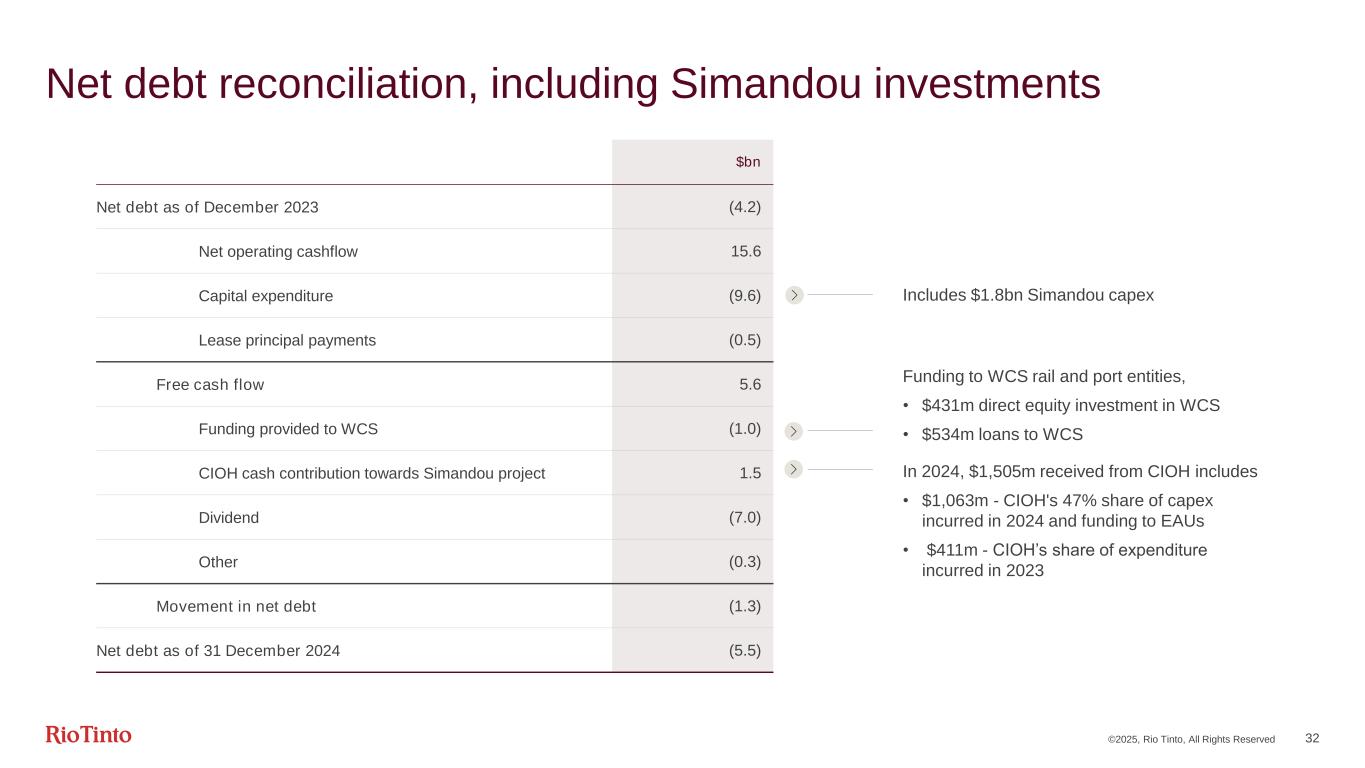 ©2025, Rio Tinto, All Rights Reserved 32 Net debt reconciliation, including Simandou investments $bn Net debt as of December 2023 (4.2) Net operating cashflow 15.6 Capital expenditure (9.6) Lease principal payments (0.5) Free cash flow 5.6 Funding provided to WCS (1.0) CIOH cash contribution towards Simandou project 1.5 Dividend (7.0) Other (0.3) Movement in net debt (1.3) Net debt as of 31 December 2024 (5.5) Includes $1.8bn Simandou capex Funding to WCS rail and port entities, • $431m direct equity investment in WCS • $534m loans to WCS In 2024, $1,505m received from CIOH includes • $1,063m - CIOH's 47% share of capex incurred in 2024 and funding to EAUs • $411m - CIOH’s share of expenditure incurred in 2023