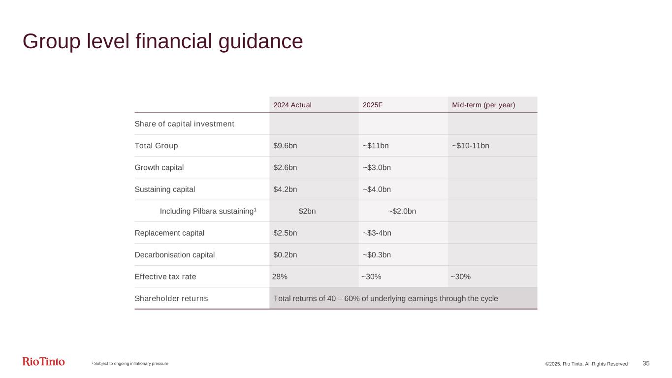 ©2025, Rio Tinto, All Rights Reserved 34 Production guidance 1 Pilbara shipments guidance remains subject to weather, market conditions and management of cultural heritage 2 Includes Oyu Tolgoi on a 100% consolidated basis and continues to reflect our 30% share of Escondida 3 From Q1 2025, we will report copper production and guidance as one metric, in order to simplify reporting and align with peer practices. 4 Iron Ore Company of Canada 2024 Actual 2025 Guidance Pilbara iron ore shipments1 (100% basis) 328.6Mt 323 – 338Mt Copper Copper consolidated 792.6kt 780 – 850kt3 Mined Copper (consolidated basis)2 697.1kt Refined Copper 248.3kt Aluminium Bauxite 58.7Mt 57 – 59Mt Alumina 7.3Mt 7.4 – 7.8Mt Aluminium 3.3Mt 3.25 – 3.45Mt Minerals TiO2 1.0Mt 1.0 – 1.2Mt IOC pellets and concentrate4 9.4 Mt 9.7 – 11.4Mt B2O3 0.5Mt ~0.5Mt