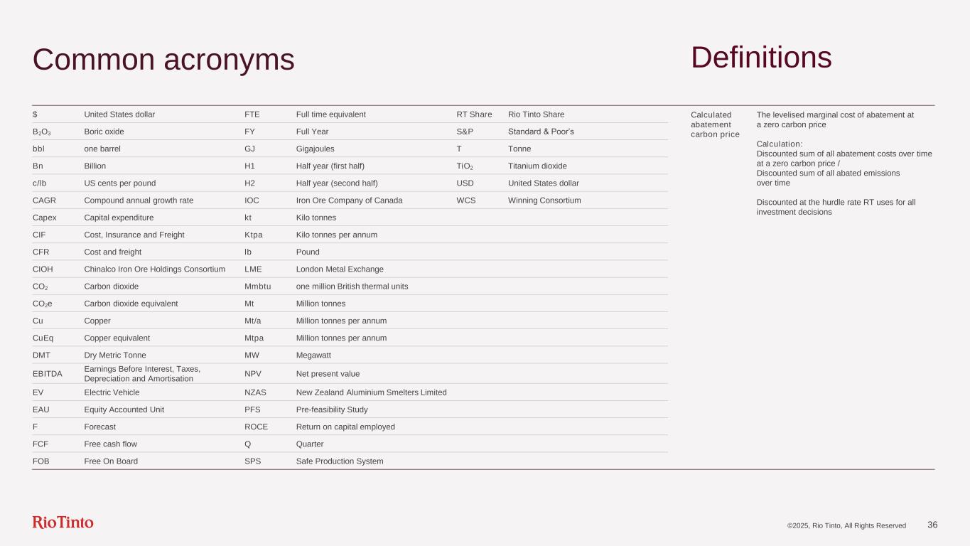 Common acronyms $ United States dollar FTE Full time equivalent RT Share Rio Tinto Share Calculated abatement carbon price The levelised marginal cost of abatement at a zero carbon price Calculation: Discounted sum of all abatement costs over time at a zero carbon price / Discounted sum of all abated emissions over time Discounted at the hurdle rate RT uses for all investment decisions B2O3 Boric oxide FY Full Year S&P Standard & Poor’s bbl one barrel GJ Gigajoules T Tonne Bn Billion H1 Half year (first half) TiO2 Titanium dioxide c/lb US cents per pound H2 Half year (second half) USD United States dollar CAGR Compound annual growth rate IOC Iron Ore Company of Canada WCS Winning Consortium Capex Capital expenditure kt Kilo tonnes CIF Cost, Insurance and Freight Ktpa Kilo tonnes per annum CFR Cost and freight lb Pound CIOH Chinalco Iron Ore Holdings Consortium LME London Metal Exchange CO2 Carbon dioxide Mmbtu one million British thermal units CO2e Carbon dioxide equivalent Mt Million tonnes Cu Copper Mt/a Million tonnes per annum CuEq Copper equivalent Mtpa Million tonnes per annum DMT Dry Metric Tonne MW Megawatt EBITDA Earnings Before Interest, Taxes, Depreciation and Amortisation NPV Net present value EV Electric Vehicle NZAS New Zealand Aluminium Smelters Limited EAU Equity Accounted Unit PFS Pre-feasibility Study F Forecast ROCE Return on capital employed FCF Free cash flow Q Quarter FOB Free On Board SPS Safe Production System Definitions ©2025, Rio Tinto, All Rights Reserved 36