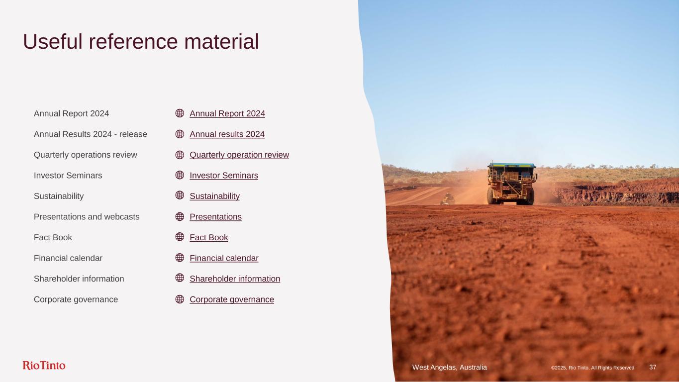 ©2025, Rio Tinto, All Rights Reserved 37 Useful reference material Annual Report 2024 Annual Report 2024 Annual Results 2024 - release Annual results 2024 Quarterly operations review Quarterly operation review Investor Seminars Investor Seminars Sustainability Sustainability Presentations and webcasts Presentations Fact Book Fact Book Financial calendar Financial calendar Shareholder information Shareholder information Corporate governance Corporate governance West Angelas, Australia