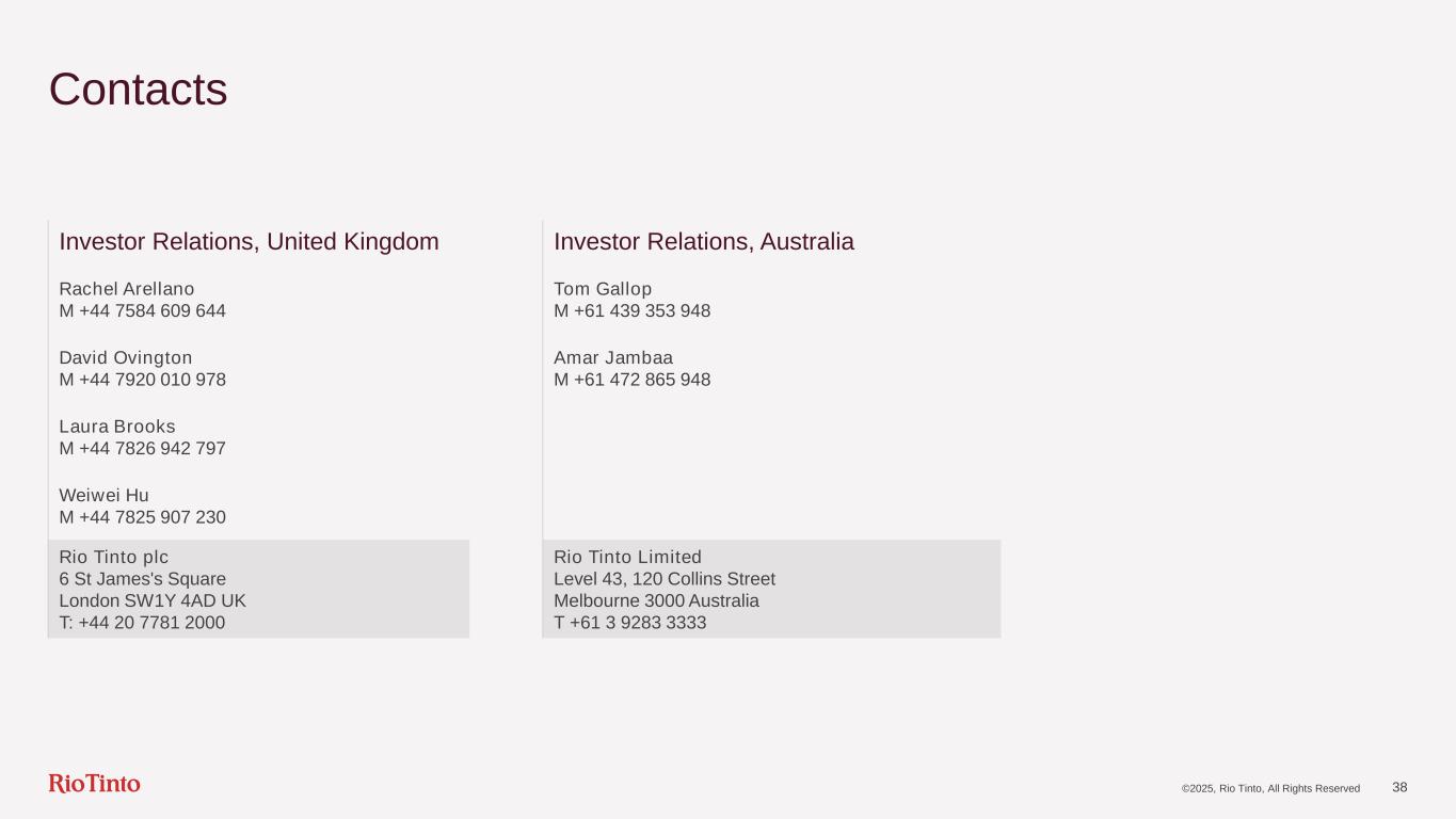 ©2025, Rio Tinto, All Rights Reserved 38 Contacts Investor Relations, United Kingdom Investor Relations, Australia Rachel Arellano M +44 7584 609 644 Tom Gallop M +61 439 353 948 David Ovington M +44 7920 010 978 Amar Jambaa M +61 472 865 948 Laura Brooks M +44 7826 942 797 Weiwei Hu M +44 7825 907 230 Rio Tinto plc 6 St James's Square London SW1Y 4AD UK T: +44 20 7781 2000 Rio Tinto Limited Level 43, 120 Collins Street Melbourne 3000 Australia T +61 3 9283 3333