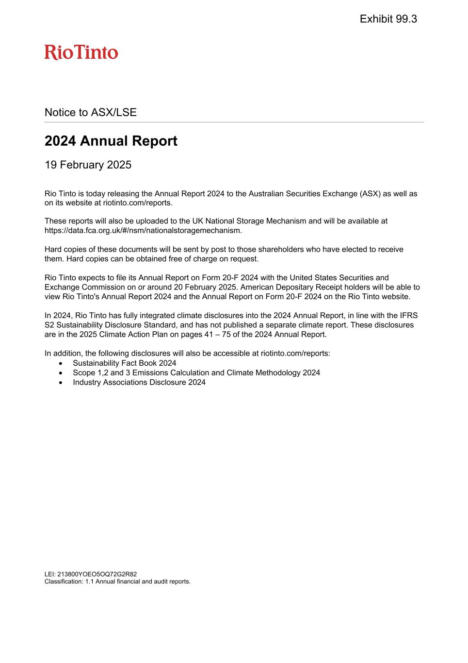Notice to ASX/LSE 2024 Annual Report 19 February 2025 Rio Tinto is today releasing the Annual Report 2024 to the Australian Securities Exchange (ASX) as well as on its website at riotinto.com/reports. These reports will also be uploaded to the UK National Storage Mechanism and will be available at https://data.fca.org.uk/#/nsm/nationalstoragemechanism. Hard copies of these documents will be sent by post to those shareholders who have elected to receive them. Hard copies can be obtained free of charge on request. Rio Tinto expects to file its Annual Report on Form 20-F 2024 with the United States Securities and Exchange Commission on or around 20 February 2025. American Depositary Receipt holders will be able to view Rio Tinto's Annual Report 2024 and the Annual Report on Form 20-F 2024 on the Rio Tinto website. In 2024, Rio Tinto has fully integrated climate disclosures into the 2024 Annual Report, in line with the IFRS S2 Sustainability Disclosure Standard, and has not published a separate climate report. These disclosures are in the 2025 Climate Action Plan on pages 41 – 75 of the 2024 Annual Report. In addition, the following disclosures will also be accessible at riotinto.com/reports:  Sustainability Fact Book 2024  Scope 1,2 and 3 Emissions Calculation and Climate Methodology 2024  Industry Associations Disclosure 2024 LEI: 213800YOEO5OQ72G2R82 Classification: 1.1 Annual financial and audit reports. Exhibit 99.3