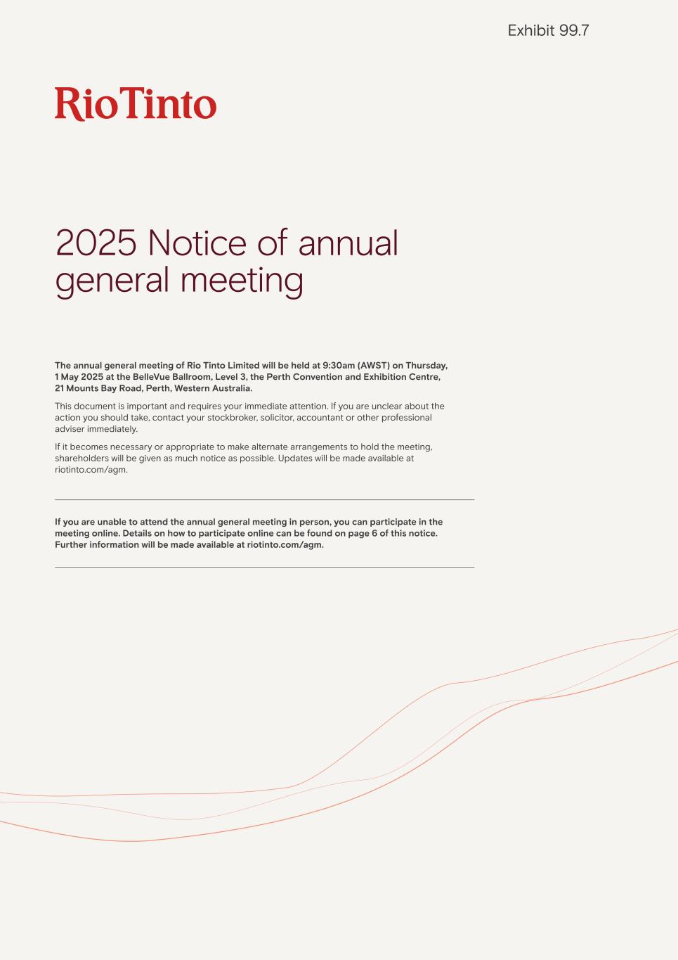 2025 Notice of annual general meeting The annual general meeting of Rio Tinto Limited will be held at 9:30am (AWST) on Thursday, 1 May 2025 at the BelleVue Ballroom, Level 3, the Perth Convention and Exhibition Centre, 21 Mounts Bay Road, Perth, Western Australia. This document is important and requires your immediate attention. If you are unclear about the action you should take, contact your stockbroker, solicitor, accountant or other professional adviser immediately. If it becomes necessary or appropriate to make alternate arrangements to hold the meeting, shareholders will be given as much notice as possible. Updates will be made available at riotinto.com/agm. If you are unable to attend the annual general meeting in person, you can participate in the meeting online. Details on how to participate online can be found on page 6 of this notice. Further information will be made available at riotinto.com/agm. Exhibit 99.7