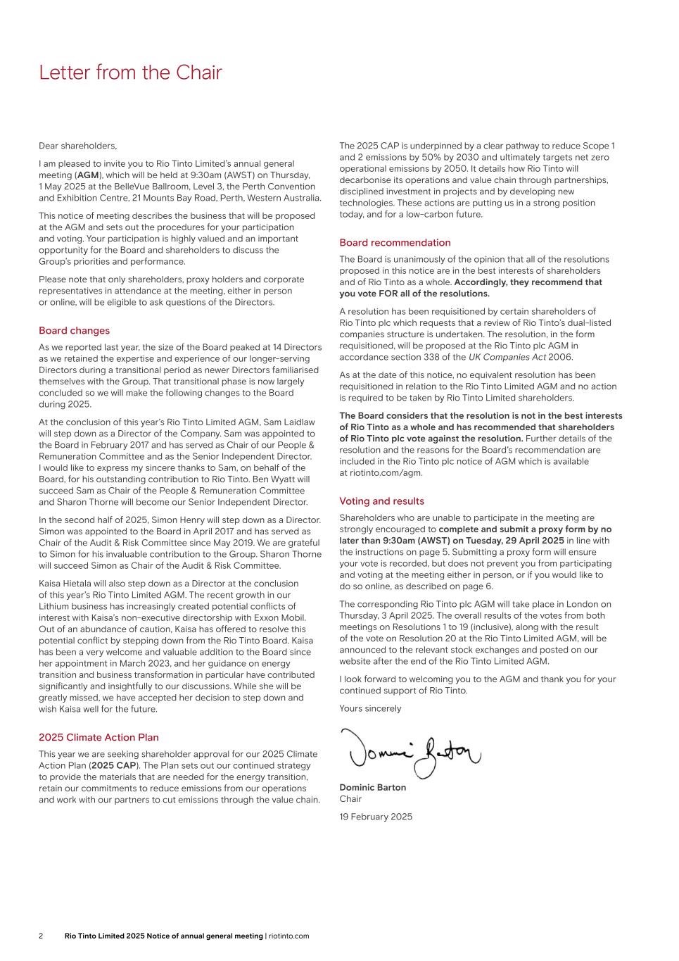 Letter from the Chair Dear shareholders, I am pleased to invite you to Rio Tinto Limited’s annual general meeting (AGM), which will be held at 9:30am (AWST) on Thursday, 1 May 2025 at the BelleVue Ballroom, Level 3, the Perth Convention and Exhibition Centre, 21 Mounts Bay Road, Perth, Western Australia. This notice of meeting describes the business that will be proposed at the AGM and sets out the procedures for your participation and voting. Your participation is highly valued and an important opportunity for the Board and shareholders to discuss the Group’s priorities and performance. Please note that only shareholders, proxy holders and corporate representatives in attendance at the meeting, either in person or online, will be eligible to ask questions of the Directors. Board changes As we reported last year, the size of the Board peaked at 14 Directors as we retained the expertise and experience of our longer-serving Directors during a transitional period as newer Directors familiarised themselves with the Group. That transitional phase is now largely concluded so we will make the following changes to the Board during 2025. At the conclusion of this year’s Rio Tinto Limited AGM, Sam Laidlaw will step down as a Director of the Company. Sam was appointed to the Board in February 2017 and has served as Chair of our People & Remuneration Committee and as the Senior Independent Director. I would like to express my sincere thanks to Sam, on behalf of the Board, for his outstanding contribution to Rio Tinto. Ben Wyatt will succeed Sam as Chair of the People & Remuneration Committee and Sharon Thorne will become our Senior Independent Director. In the second half of 2025, Simon Henry will step down as a Director. Simon was appointed to the Board in April 2017 and has served as Chair of the Audit & Risk Committee since May 2019. We are grateful to Simon for his invaluable contribution to the Group. Sharon Thorne will succeed Simon as Chair of the Audit & Risk Committee. Kaisa Hietala will also step down as a Director at the conclusion of this year’s Rio Tinto Limited AGM. The recent growth in our Lithium business has increasingly created potential conflicts of interest with Kaisa’s non-executive directorship with Exxon Mobil. Out of an abundance of caution, Kaisa has offered to resolve this potential conflict by stepping down from the Rio Tinto Board. Kaisa has been a very welcome and valuable addition to the Board since her appointment in March 2023, and her guidance on energy transition and business transformation in particular have contributed significantly and insightfully to our discussions. While she will be greatly missed, we have accepted her decision to step down and wish Kaisa well for the future. 2025 Climate Action Plan This year we are seeking shareholder approval for our 2025 Climate Action Plan (2025 CAP). The Plan sets out our continued strategy to provide the materials that are needed for the energy transition, retain our commitments to reduce emissions from our operations and work with our partners to cut emissions through the value chain. The 2025 CAP is underpinned by a clear pathway to reduce Scope 1 and 2 emissions by 50% by 2030 and ultimately targets net zero operational emissions by 2050. It details how Rio Tinto will decarbonise its operations and value chain through partnerships, disciplined investment in projects and by developing new technologies. These actions are putting us in a strong position today, and for a low-carbon future. Board recommendation The Board is unanimously of the opinion that all of the resolutions proposed in this notice are in the best interests of shareholders and of Rio Tinto as a whole. Accordingly, they recommend that you vote FOR all of the resolutions. A resolution has been requisitioned by certain shareholders of Rio Tinto plc which requests that a review of Rio Tinto’s dual-listed companies structure is undertaken. The resolution, in the form requisitioned, will be proposed at the Rio Tinto plc AGM in accordance section 338 of the UK Companies Act 2006. As at the date of this notice, no equivalent resolution has been requisitioned in relation to the Rio Tinto Limited AGM and no action is required to be taken by Rio Tinto Limited shareholders. The Board considers that the resolution is not in the best interests of Rio Tinto as a whole and has recommended that shareholders of Rio Tinto plc vote against the resolution. Further details of the resolution and the reasons for the Board’s recommendation are included in the Rio Tinto plc notice of AGM which is available at riotinto.com/agm. Voting and results Shareholders who are unable to participate in the meeting are strongly encouraged to complete and submit a proxy form by no later than 9:30am (AWST) on Tuesday, 29 April 2025 in line with the instructions on page 5. Submitting a proxy form will ensure your vote is recorded, but does not prevent you from participating and voting at the meeting either in person, or if you would like to do so online, as described on page 6. The corresponding Rio Tinto plc AGM will take place in London on Thursday, 3 April 2025. The overall results of the votes from both meetings on Resolutions 1 to 19 (inclusive), along with the result of the vote on Resolution 20 at the Rio Tinto Limited AGM, will be announced to the relevant stock exchanges and posted on our website after the end of the Rio Tinto Limited AGM. I look forward to welcoming you to the AGM and thank you for your continued support of Rio Tinto. Yours sincerely Dominic Barton Chair 19 February 2025 2 Rio Tinto Limited 2025 Notice of annual general meeting | riotinto.com