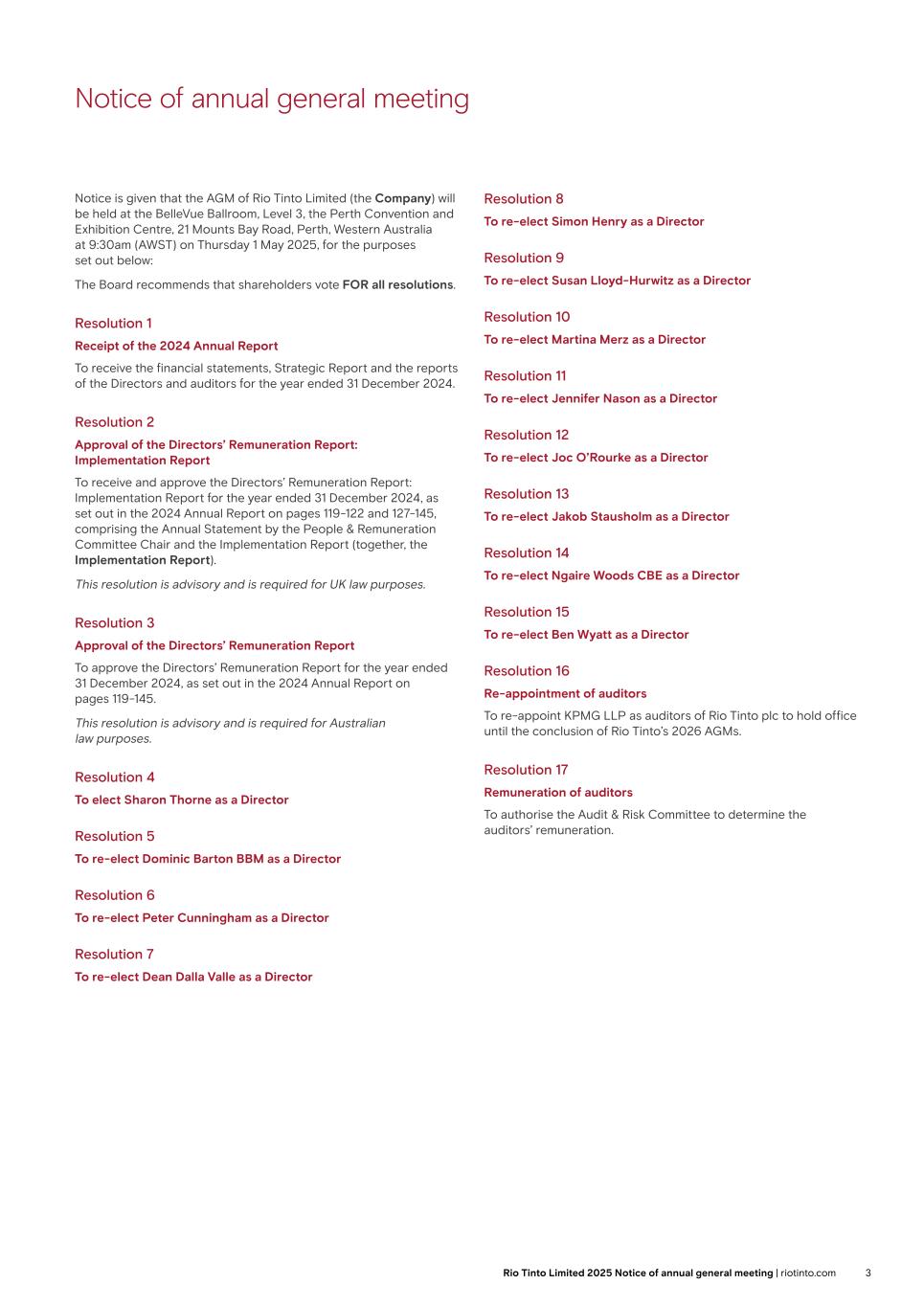 Notice of annual general meeting Notice is given that the AGM of Rio Tinto Limited (the Company) will be held at the BelleVue Ballroom, Level 3, the Perth Convention and Exhibition Centre, 21 Mounts Bay Road, Perth, Western Australia at 9:30am (AWST) on Thursday 1 May 2025, for the purposes set out below: The Board recommends that shareholders vote FOR all resolutions. Resolution 1 Receipt of the 2024 Annual Report To receive the financial statements, Strategic Report and the reports of the Directors and auditors for the year ended 31 December 2024. Resolution 2 Approval of the Directors’ Remuneration Report: Implementation Report To receive and approve the Directors’ Remuneration Report: Implementation Report for the year ended 31 December 2024, as set out in the 2024 Annual Report on pages 119-122 and 127-145, comprising the Annual Statement by the People & Remuneration Committee Chair and the Implementation Report (together, the Implementation Report). This resolution is advisory and is required for UK law purposes. Resolution 3 Approval of the Directors’ Remuneration Report To approve the Directors’ Remuneration Report for the year ended 31 December 2024, as set out in the 2024 Annual Report on pages 119-145. This resolution is advisory and is required for Australian law purposes. Resolution 4 To elect Sharon Thorne as a Director Resolution 5 To re-elect Dominic Barton BBM as a Director Resolution 6 To re-elect Peter Cunningham as a Director Resolution 7 To re-elect Dean Dalla Valle as a Director Resolution 8 To re-elect Simon Henry as a Director Resolution 9 To re-elect Susan Lloyd-Hurwitz as a Director Resolution 10 To re-elect Martina Merz as a Director Resolution 11 To re-elect Jennifer Nason as a Director Resolution 12 To re-elect Joc O’Rourke as a Director Resolution 13 To re-elect Jakob Stausholm as a Director Resolution 14 To re-elect Ngaire Woods CBE as a Director Resolution 15 To re-elect Ben Wyatt as a Director Resolution 16 Re-appointment of auditors To re-appoint KPMG LLP as auditors of Rio Tinto plc to hold office until the conclusion of Rio Tinto’s 2026 AGMs. Resolution 17 Remuneration of auditors To authorise the Audit & Risk Committee to determine the auditors’ remuneration. 3Rio Tinto Limited 2025 Notice of annual general meeting | riotinto.com